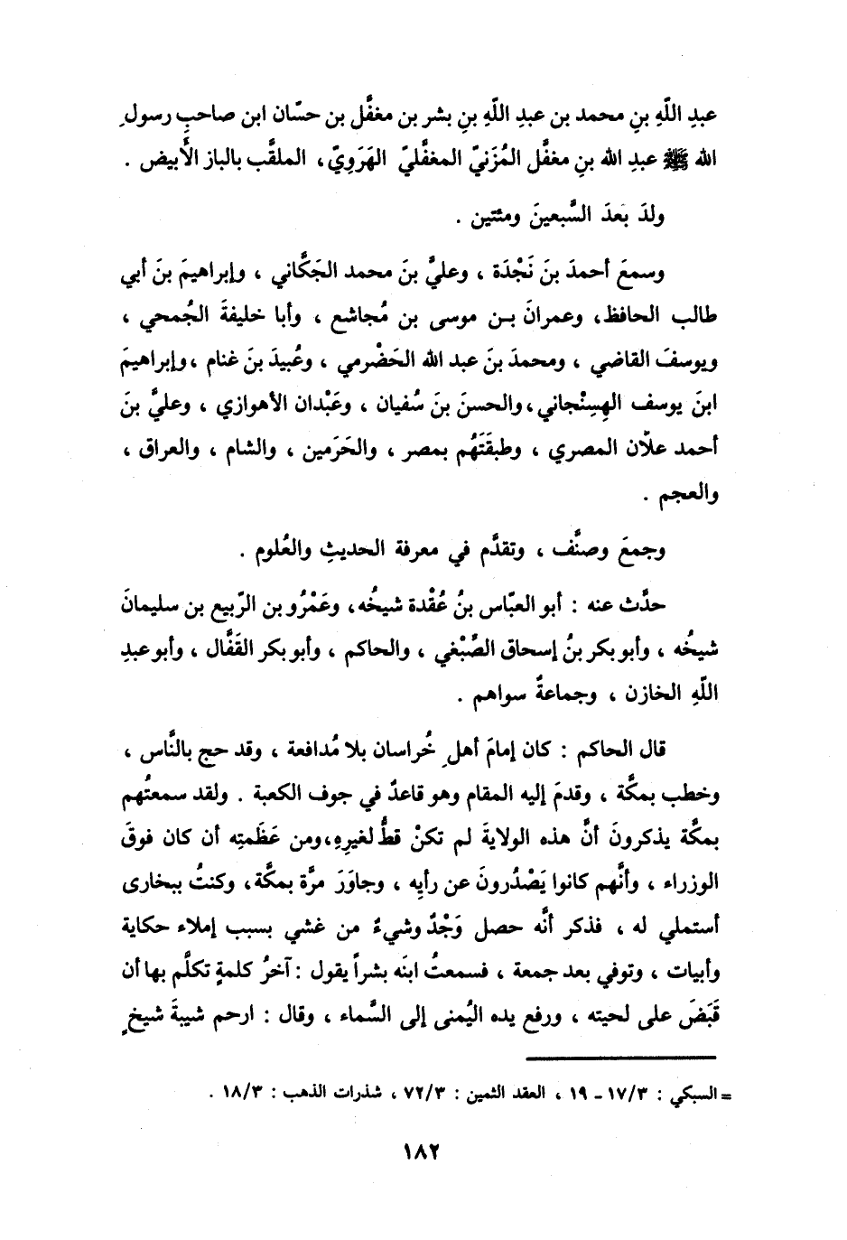 قَالَ الحَاكِمُ: كَانَ إِمَامُ أَهْلِ خُرَاسَانَ بِلاَ مُدَافعَةٍ، وَقَدْ حَجَّ بِالنَّاسِ، وَخطبَ بِمَكَّةَ، وَقدمَ إِلَيْهِ المقَامُ، وَهُوَ قَاعدٌ فِي جوفِ الكَعْبَةِ.