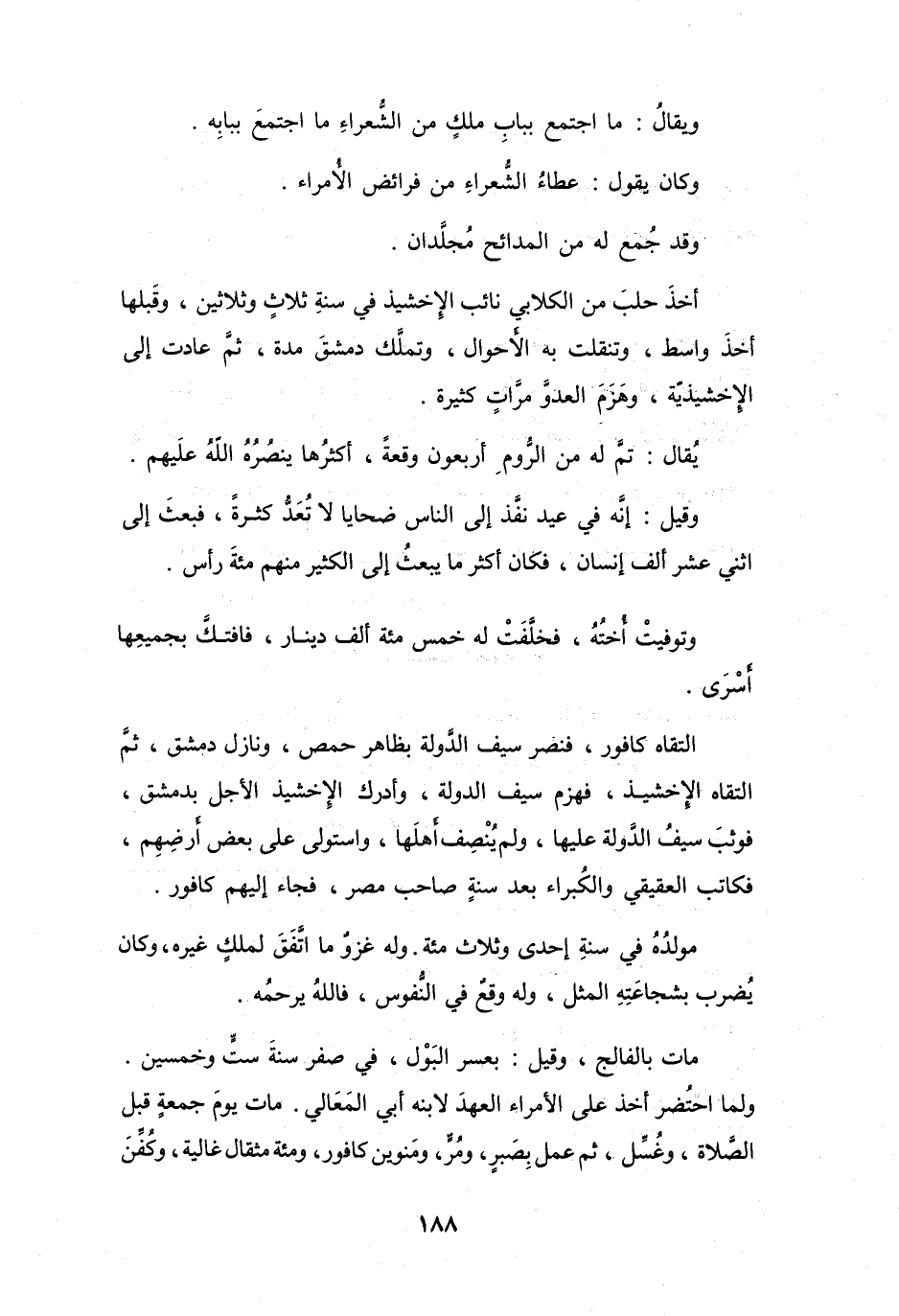 التَقَاهُ كَافورٌ، فَنُصِرَ سَيْفُ الدَّوْلَةِ بِظَاهِرِ حِمْصَ، وَنَازَلَ دِمَشْقَ، ثُمَّ التَقَاهُ الإِخْشِيْذُ، فَهَزَمَ سَيْفَ الدَّوْلَةِ، وَأَدركَ الإِخْشِيْذَ الأَجلُ بِدِمَشْقَ، فَوَثَبَ سَيْفُ الدَّوْلَةِ عَلَيْهَا، وَلَمْ يُنْصِفْ أَهْلَهَا، وَاسْتَوْلَى عَلَى بَعْضِ أَرْضِهِمْ، فَكَاتَبَ العَقِيْقيُّ وَالكُبَرَاءُ بَعْدَ سنَةٍ صَاحِبَ مِصْرَ، فَجَاءَ إِلَيْهِم كَافورٌ.