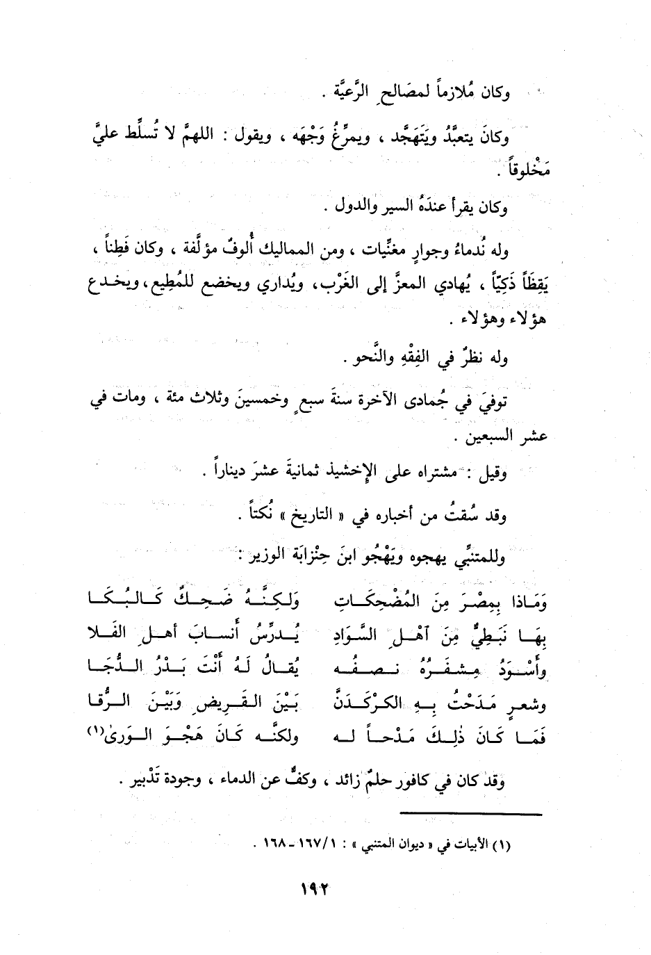 وَقَدْ كَانَ فِي كَافورٍ حلمٌ زَائِدٌ، وَكفٌّ عَنِ الدِّمَاءِ، وَجودَةِ تَدْبِيرٍ.
