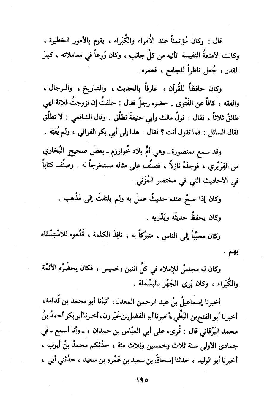 وَكَانَ حَافِظاً للقُرَآنِ، عَارِفاً بِالحَدِيْثِ، وَالتَّارِيْخِ، وَالرِّجَالِ، وَالفِقْهِ، كَافّاً عَنِ الفَتْوَى.