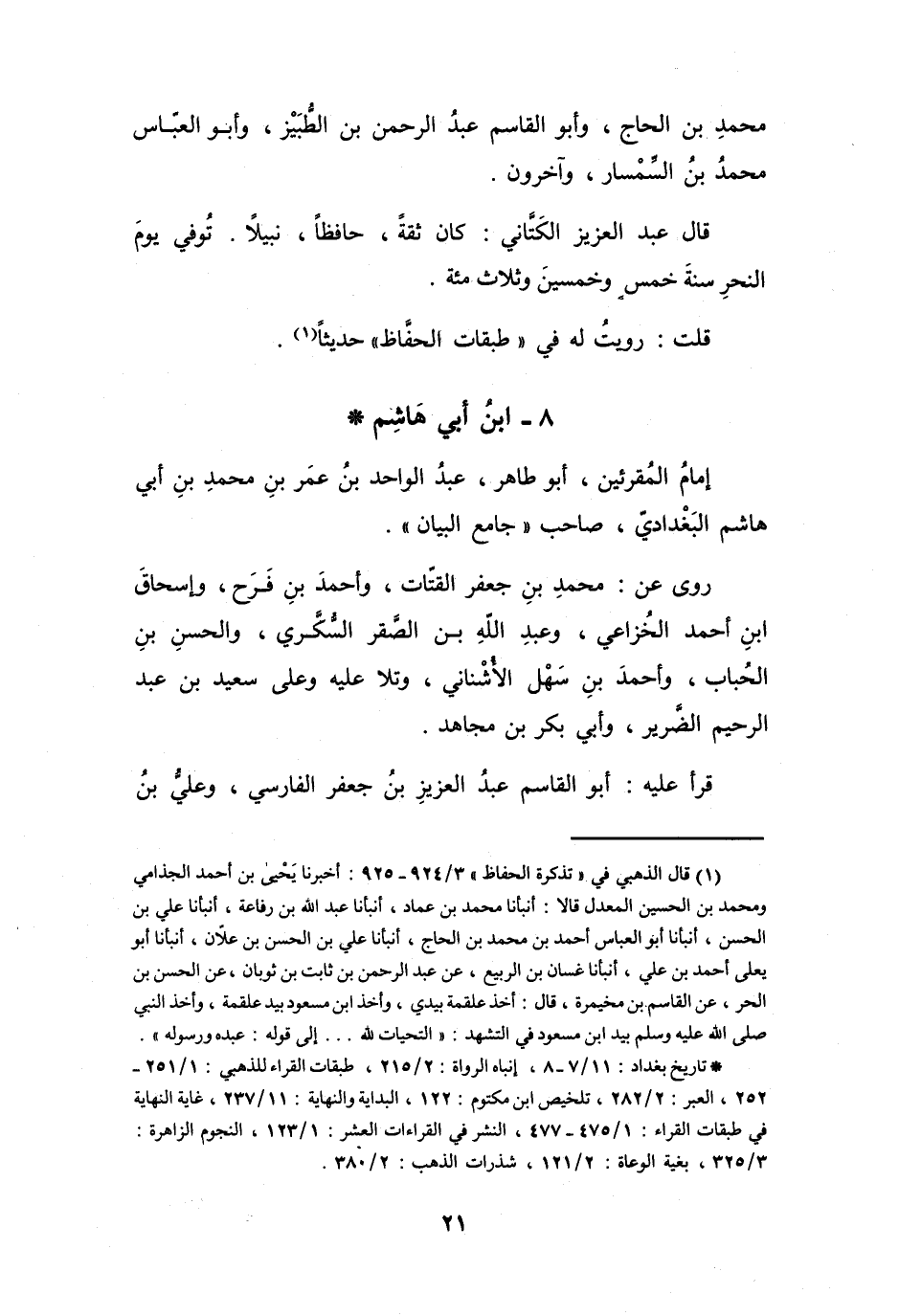 (*) تاريخ بغداد: 11 / 7 - 8، إنباه الرواة: 2 / 215، طبقات القراء للذهبي: 1 / 251 - 252، العبر: 2 / 282، تلخيص ابن مكتوم: 122، البداية والنهاية: 11 / 237، غاية النهاية في طبقات القراء: 1 / 475 - 477، النشر في القراءات العشر: 1 / 123، النجوم الزاهرة: 3 / 325، بغية الوعاة: 2 / 121، شذرات الذهب: 2 / 380.
