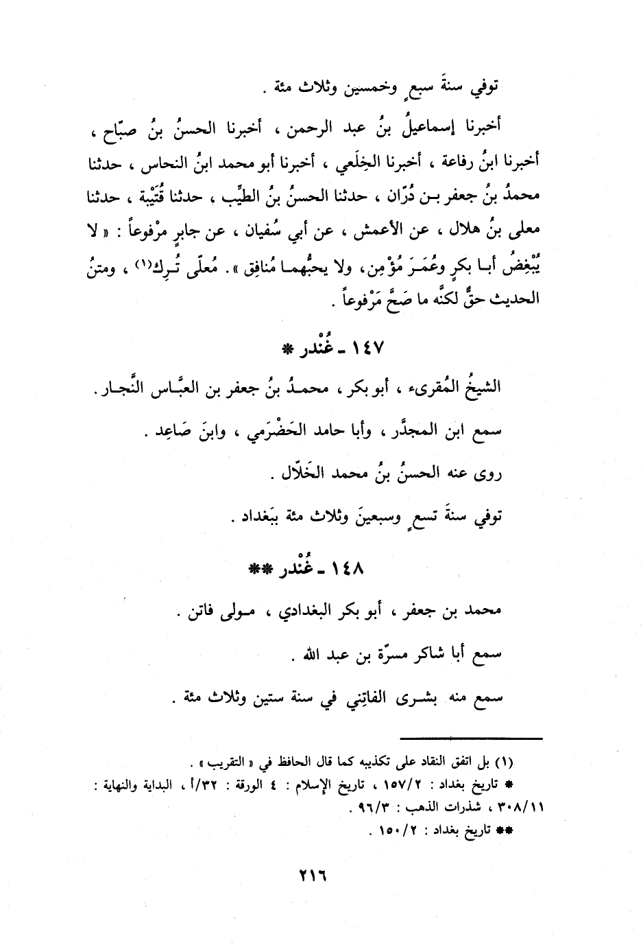 147 - غُنْدَرٌ أَبُو بَكْرٍ مُحَمَّدُ بنُ جَعْفَرِ بنِ العَبَّاسِ النَّجَّارُ *
