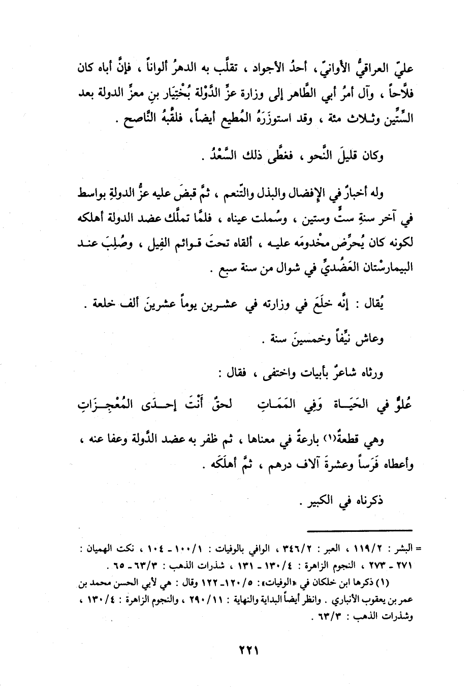 وَهِيَ قطعَةٌ (1) بارعَةٌ فِي معنَاهَا، ثُمَّ ظَفرَ بِهِ عَضُدُ الدَّوْلَةِ وَعَفَا عَنْهُ، وَأَعطَاهُ فَرَساً وَعشرَةَ آلاَفِ دِرْهَمٍ، ثُمَّ أَهلَكَهُ.