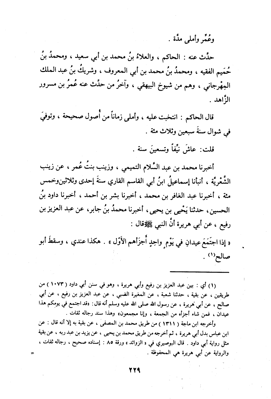 (1) أي: بين عبد العزيز بن رفيع وأبي هريرة، وهو في سنن أبي داود (1073) من طريقين، عن بقية، حدثنا شعبة، عن المغيرة الضبي، عن عبد العزيز بن رفيع، عن أبي صالح، عن أبي هريرة، عن رسول الله صلى الله عليه وسلم أنه قال: " قد اجتمع في يومكم هذا عيدان، فمن شاء أجزأه من الجمعة، وإنا مجمعون " وهذا سند رجاله ثقات.