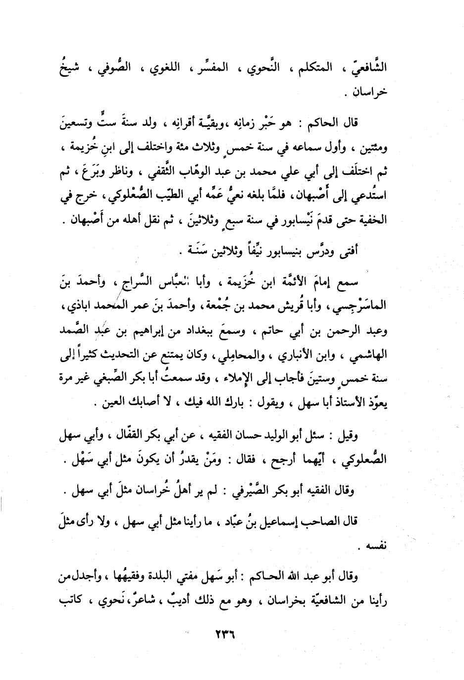 قَالَ الحَاكِمُ: هُوَ حَبْرُ زَمَانِهِ، وَبَقِيَّةُ أَقْرَانِهِ، وُلِدَ سَنَةَ سِتٍّ وَتِسْعِيْنَ وَمائَتَيْنِ، وَأَوَّلُ سمَاعِهِ فِي سَنَةِ خَمْسٍ وَثَلاَثِ مائَةٍ وَاختلَفَ إِلَى ابْنِ خُزَيْمَةَ، ثُمَّ اختلَفَ إِلَى أَبِي عَلِيٍّ مُحَمَّدِ بنِ عَبْدِ الوَهَّابِ الثَّقَفِيِّ، وَنَاظَرَ وَبَرَعَ، ثُمَّ اسْتُدْعِيَ إِلَى أَصْبَهَانَ، فَلَمَّا بَلَغَهُ نَعْيُّ عَمِّهِ أَبِي الطَّيِّبِ الصُّعْلُوْكِيِّ، خَرَجَ فِي الخِفْيَةِ حَتَّى قَدِمَ نَيْسَابُوْرَ فِي سَنَةِ سَبْعٍ وَثَلاَثِيْنَ، ثُمَّ نَقَلَ أَهْلَهُ مِنْ أَصْبَهَانَ.
