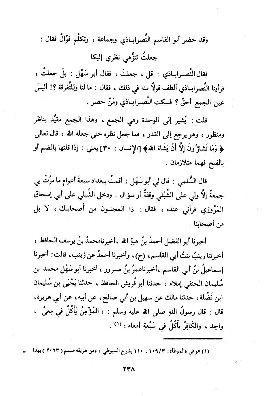 فَقَالَ النَّصرَابَاذِي: قُلْ، جعلتَ، فَقَالَ أَبُو سَهْلٍ: بَلْ جعلتُ، فَرَأَينَا النَّصرَابَاذِي أَلطَفُ قَوْلاً مِنْهُ فِي ذَلِكَ، فَقَالَ: مَا لَنَا وَلِلتَّفرِقَةِ؟ أَلَيْسَ عينُ الجمعِ أَحقُّ؟ فَسَكَتَ النَّصرَابَاذِي وَمَنْ حَضَرَ.