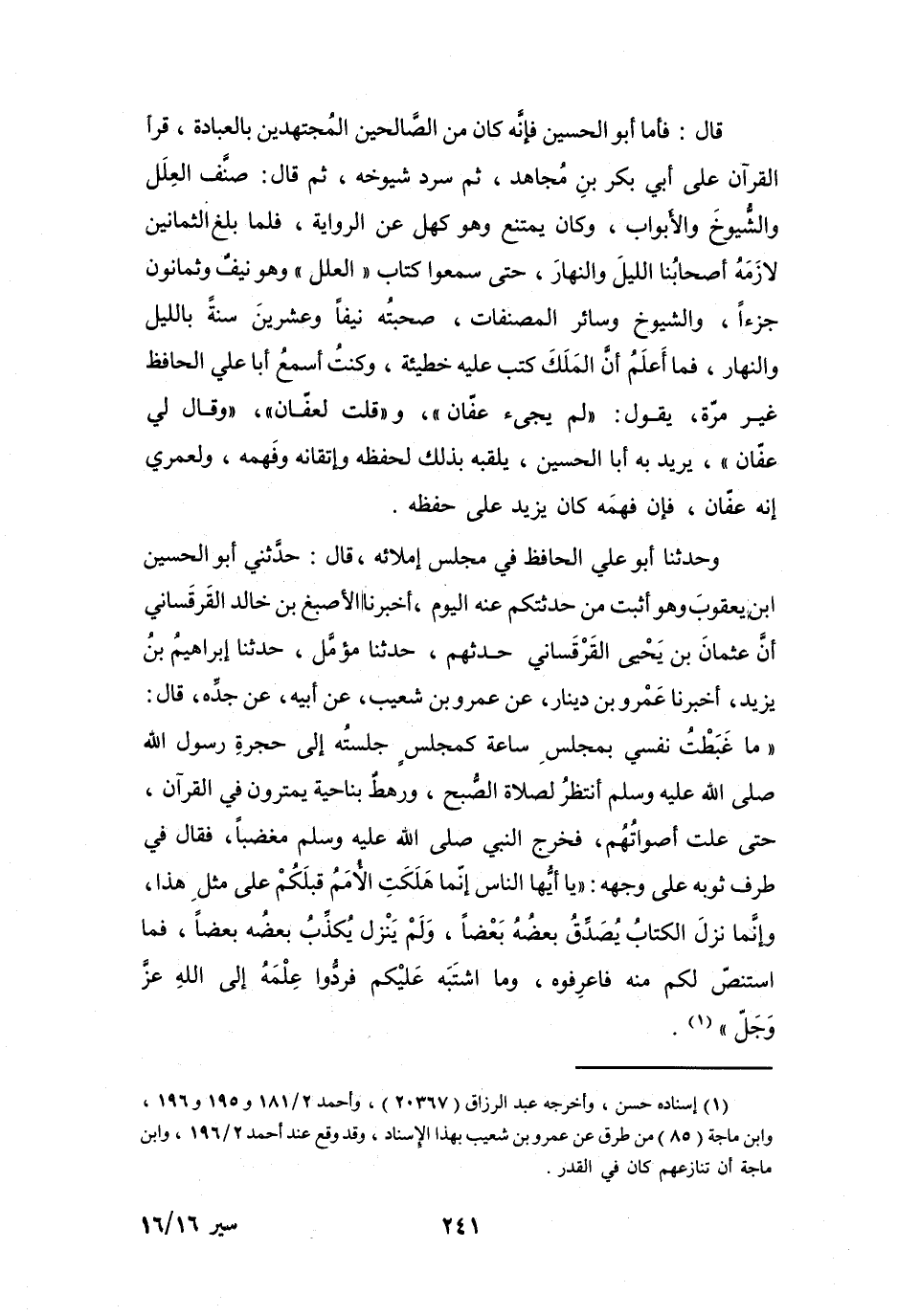 وحَدَّثَنَا أَبُو عَلِيٍّ الحَافِظُ فِي مَجْلِسِ إِملاَئِهِ، قَالَ: حَدَّثَنِي أَبُو الحُسَيْنِ بنُ يَعْقُوْبَ وَهُوَ أَثْبَتُ مَنْ حَدَّثْتُكُمْ عَنْهُ اليَوْمَ، أَخْبَرَنَا الأَصبغُ بنُ خَالِدٍ القَرْقَسَانِيُّ أَنَّ عُثْمَانَ بنَ يَحْيَى القَرْقَسَانِيَّ حَدَّثَهُم، حَدَّثَنَا مُؤَمَّلُ، حَدَّثَنَا إِبْرَاهِيْمُ بنُ يَزِيْدَ، أَخْبَرَنَا عَمْرُو بنُ دِيْنَارٍ، عَنْ عَمْرِو بنِ شُعَيْبٍ، عَنِ أَبِيهِ، عَنْ جَدِّهِ، قَالَ: مَا غَبَطْتُ نَفْسِي بِمَجْلِسِ سَاعَةٍ كمَجْلِسٍ جَلَسْتُهُ إِلَى حُجْرَةِ رَسُوْلِ اللهِ - صَلَّى اللَّهُ عَلَيْهِ وَسَلَّمَ - أَنْتَظِرُ لِصَلاَةِ الصُّبْحِ، وَرهطٌ بِنَاحيَةٍ يَمْتَرُوْنَ فِي القُرَآنِ، حَتَّى عَلَتْ أَصواتُهُمْ: