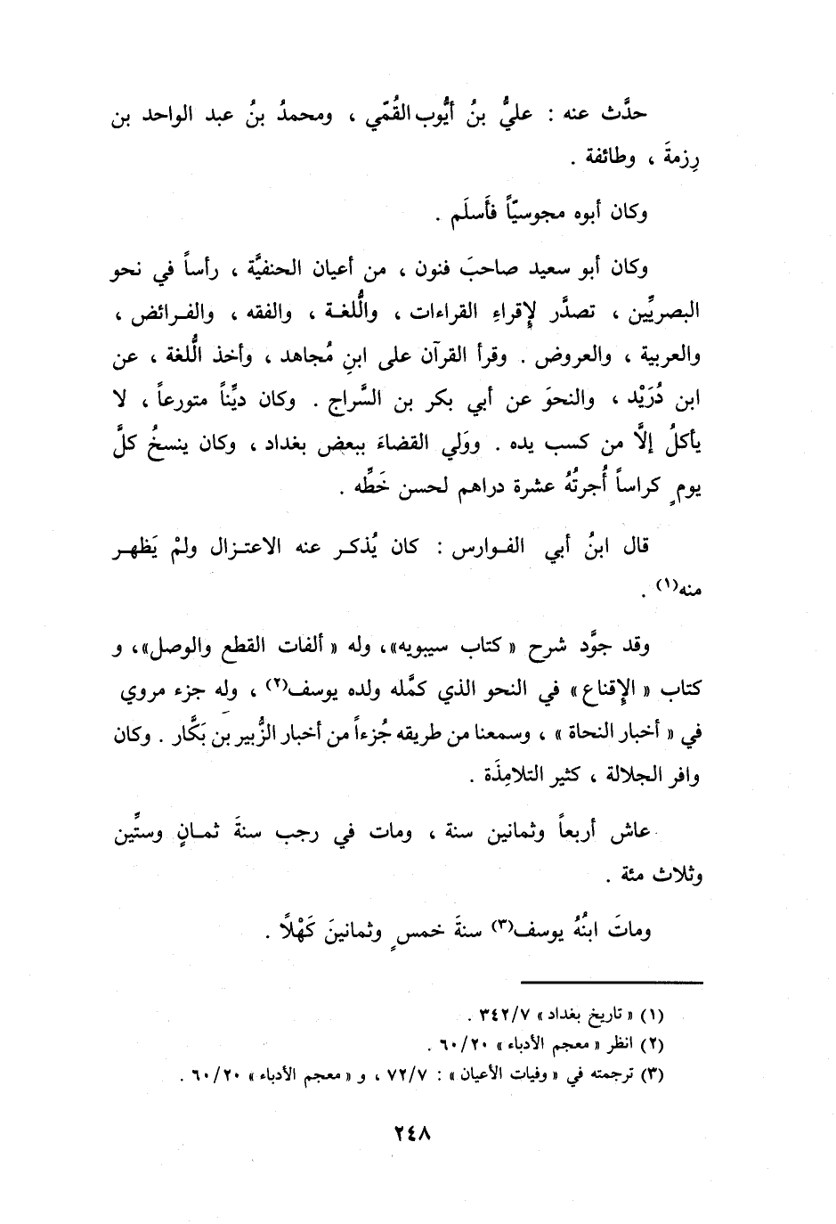 وَقَدْ جَوَّدَ شَرْحَ (كِتَابِ سِيْبَوَيْه) ، وَلَهُ (أَلفَاتُ القطعِ وَالوصلِ) ، وَكِتَابُ (الإِقنَاعِ) فِي النَّحْوِ الَّذِي كمَّلَهُ وَلدُهُ يُوْسُفُ (2) ، وَلَهُ جُزءٌ مَرْوِيٌ فِي (أَخْبَارِ النُّحَاةِ) ، وَسمِعنَا مِنْ طَرِيْقِهِ جُزْءاً مِنْ (أَخبارِ الزُّبَيْرِ بنِ بكَّارٍ) .