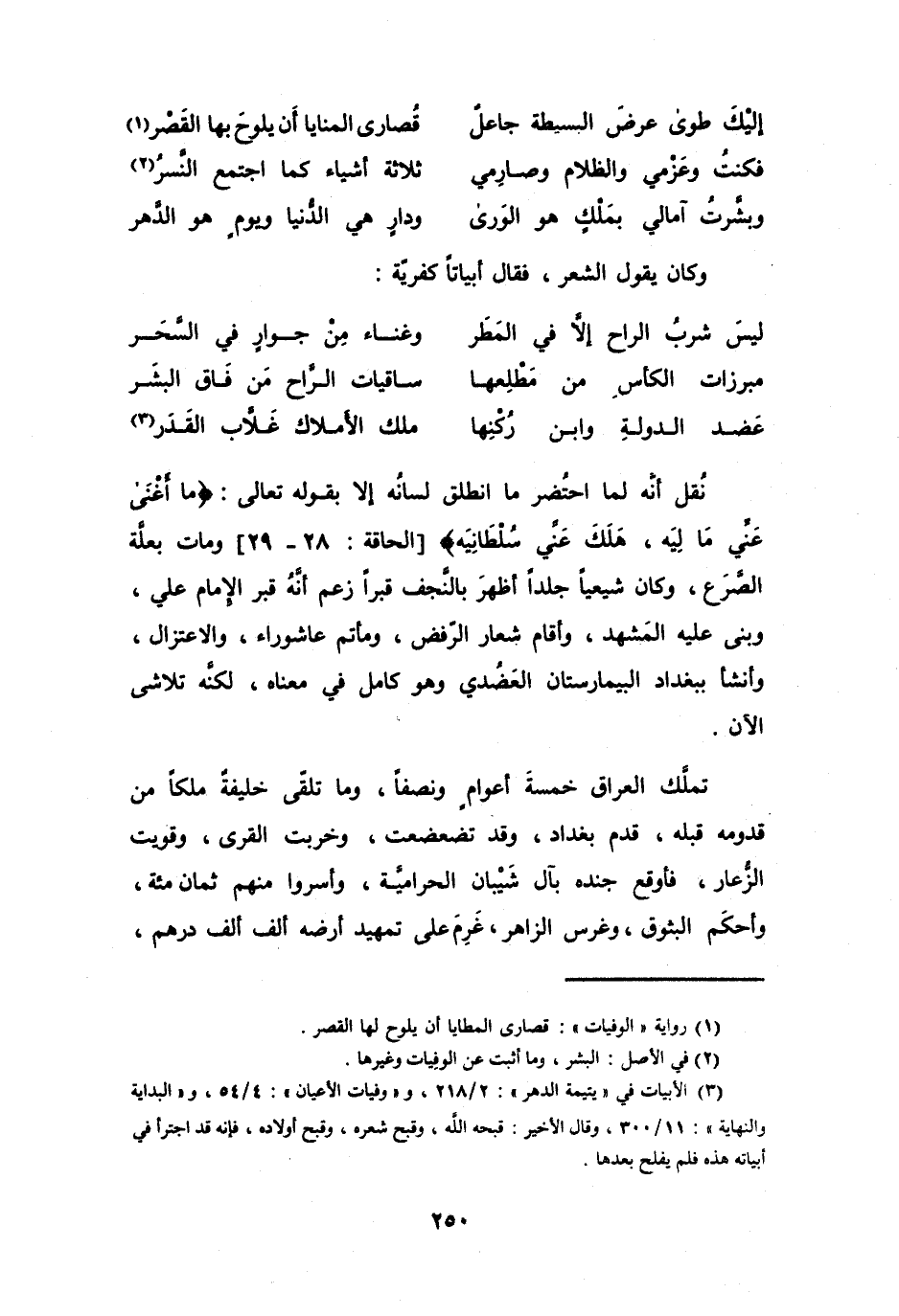 (3) الابيات في " يتيمة الدهر ": 2 / 218، و" وفيات الأعيان ": 4 / 54، و" البداية والنهاية ": 11 / 300، وقال الأخير: قبحه الله، وقبح شعره، وقبح أولاده، فإنه قد اجترأ في أبياته هذه فلم يفلح بعدها.