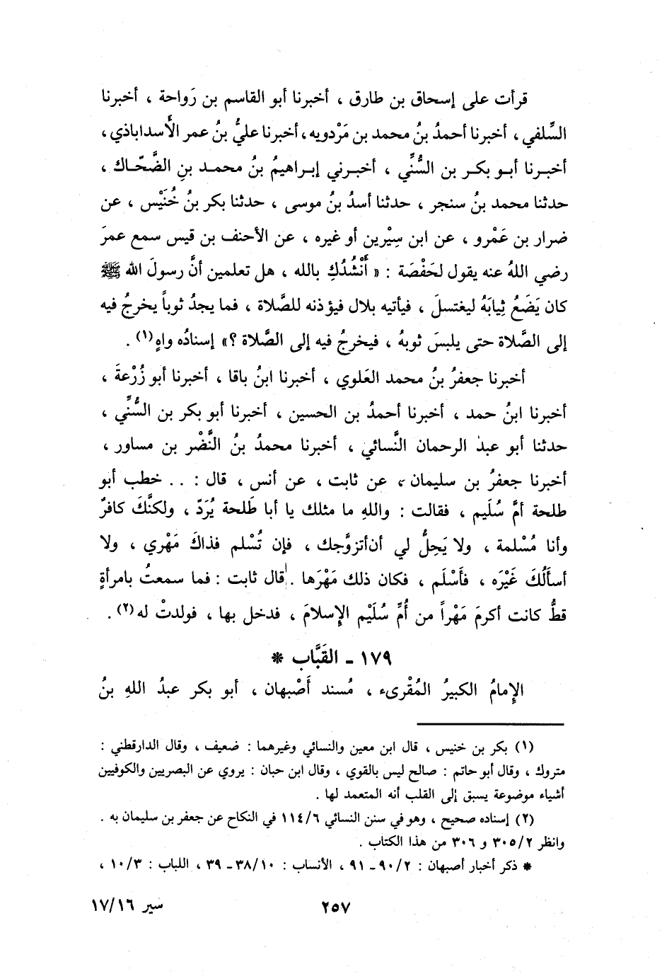 قَرَأْتُ عَلَى إِسْحَاقَ بنِ طَارِقٍ، أَخْبَرَنَا أَبُو القَاسِمِ بنِ رَوَاحَةَ، أَخْبَرَنَا السِّلَفِيُّ، أَخْبَرَنَا أَحْمَدُ بنُ مُحَمَّدِ بنِ مَرْدَوَيْه، أَخْبَرَنَا عَلِيُّ بنُ عُمَرَ الأَسدَاباذِيُّ، أَخْبَرَنَا أَبُو بَكْرٍ بنُ السُّنِّي، أَخْبَرَنِي إِبْرَاهِيْمُ بنُ مُحَمَّدِ بنِ الضَّحَّاكِ، حَدَّثَنَا مُحَمَّدُ بنُ سنجرَ، حَدَّثَنَا أَسدُ بنُ مُوْسَى، حَدَّثَنَا بَكْرُ بنُ خُنَيْسٍ، عَنْ ضِرَارِ بنِ عَمْرٍو، عَنِ ابْنِ سِيْرِيْنَ أَوْ غَيْرِهِ، عَنِ الأَحنفَ بنَ قَيْسٍ سَمِعَ عُمرَ - رَضِيَ اللهُ عَنْهُ - يَقُوْلُ لحَفْصَةَ: أَنْشُدُكِ بِاللهِ، هَلْ تعلمِينَ أَنَّ رَسُوْلَ اللهِ - صَلَّى اللَّهُ عَلَيْهِ وَسَلَّمَ - كَانَ يَضَعُ ثِيَابَهُ لِيغتسلَ، فَيَأْتيْهِ بلاَلٌ فيُؤذنَهُ لِلصَّلاَةِ، فَمَا يجدُ ثوباً يخرجُ فِيْهِ إِلَى الصَّلاَةِ حَتَّى يلبسَ ثَوْبهُ، فيخرجُ فِيْهِ إِلَى الصَّلاَةِ؟ إِسنَادُهُ وَاهٍ (1) .