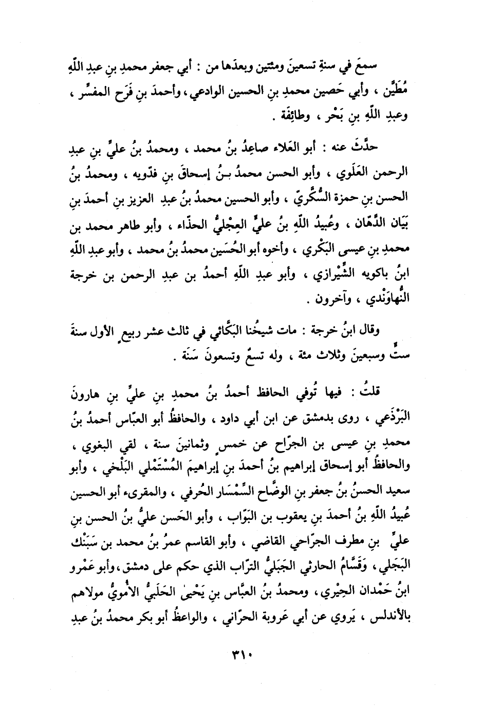 قُلْتُ: فِيْهَا تُوُفِّيَ الحَافِظُ أَحْمَدُ بنُ مُحَمَّدِ بنِ عَلِيِّ بنِ هَارُوْنَ البَرْذَعِيُّ، رَوَى بِدِمَشْقَ عَنِ ابْنِ أَبِي دَاوُدَ، وَالحَافِظُ أَبُو العَبَّاسِ أَحْمَدُ بنُ مُحَمَّدِ بنِ عِيْسَى بنِ الجَرَّاحِ عَنْ خَمْسٍ وَثَمَانِيْنَ سَنَةً، لَقِيَ البَغَوِيَّ، وَالحَافِظُ أَبُو إِسْحَاقَ إِبْرَاهِيْمُ بنُ أَحْمَدَ بنِ إِبْرَاهِيْمَ المُسْتَمْلِي البَلْخِيُّ، وَأَبُو سَعِيْدٍ الحَسَنُ بنُ جَعْفَرِ بنِ الوضَّاحِ السِّمْسَارُ الحُرفِيُّ، وَالمُقْرِئُ أَبُو الحُسَيْنِ عُبَيْدُ اللهِ بنِ أَحْمَدَ بنِ يَعْقُوْبَ بنِ البوَّابِ، وَأَبُو الحَسَنِ عَلِيُّ بنُ الحَسَنِ بنِ عَلِيِّ بنِ مطرفٍ الجَرَّاحِيُّ القَاضِي، وَأَبُو القَاسِمِ عُمَرُ بنُ مُحَمَّدِ بنِ سَبَنْكَ البَجَلِيُّ، وَقسَّامُ الحَارِثِيُّ الجبلِيُّ الترَّابُ الَّذِي حَكَمَ عَلَى دِمَشْقَ، وَأَبُو عمْرٍو بنُ حَمْدَانَ الحِيْرِيُّ، وَمُحَمَّدُ بنُ العَبَّاسِ بنِ يَحْيَى الحَلَبِيُّ الأُمَوِيُّ مَوْلاَهُمْ بِالأَنْدَلُسِ، يَرْوِي عَنْ أَبِي عَرُوْبَةَ الحَرَّانِيِّ، وَالواعظُ أَبُو بَكْرٍ مُحَمَّدُ بنُ عَبْدِ