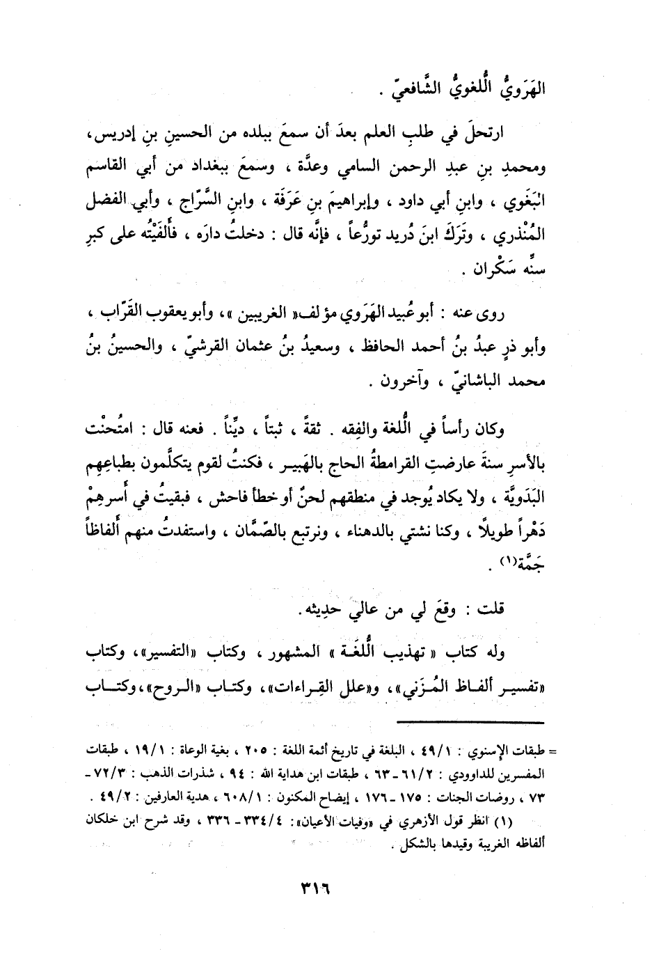 (1) انظر قول الازهري في " وفيات الأعيان " 4 / 334 - 336، وقد شرح ابن خلكان ألفاظه الغريبة وقيدها بالشكل.