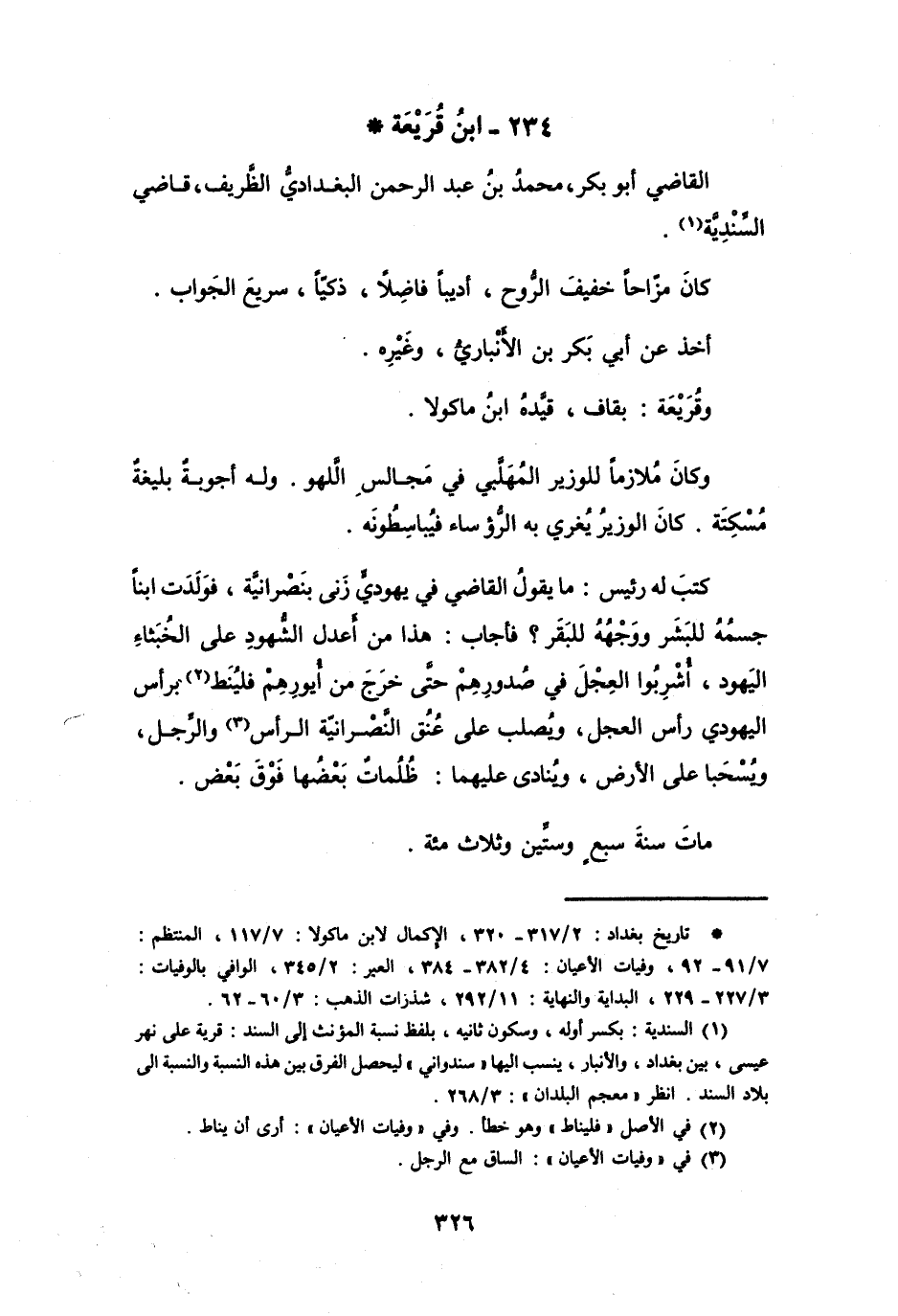 القَاضِي، أَبُو بَكْرٍ مُحَمَّدُ بنُ عَبْدِ الرَّحْمَنِ البَغْدَادِيُّ الظَّرِيفُ، قَاضِي السِّنْدِيَّةِ (1) .