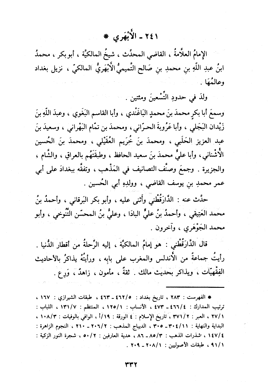 (*) الفهرست: 283، تاريخ بغداد: 5 / 462 - 463، طبقات الشيرازي: 167، ترتيب المدارك: 4 / 466 - 473، الأنساب: 1 / 125، المنتظم: 7 / 131، اللباب: 1 / 27، العبر: 2 / 371، تاريخ الإسلام: 4 الورقة: 19 / أ، الوافي بالوفيات: 3 / 108، البداية والنهاية: 11 / 304 - 305، الديباج المذهب: 2 / 206 - 210، النجوم الزاهرة: 4 / 147، شذرات الذهب: 3 / 85 - 86، هدية العارفين: 2 / 50، شجرة النور الزكية: 1 / 91، طبقات الاصوليين: 1 / 208 - 209.