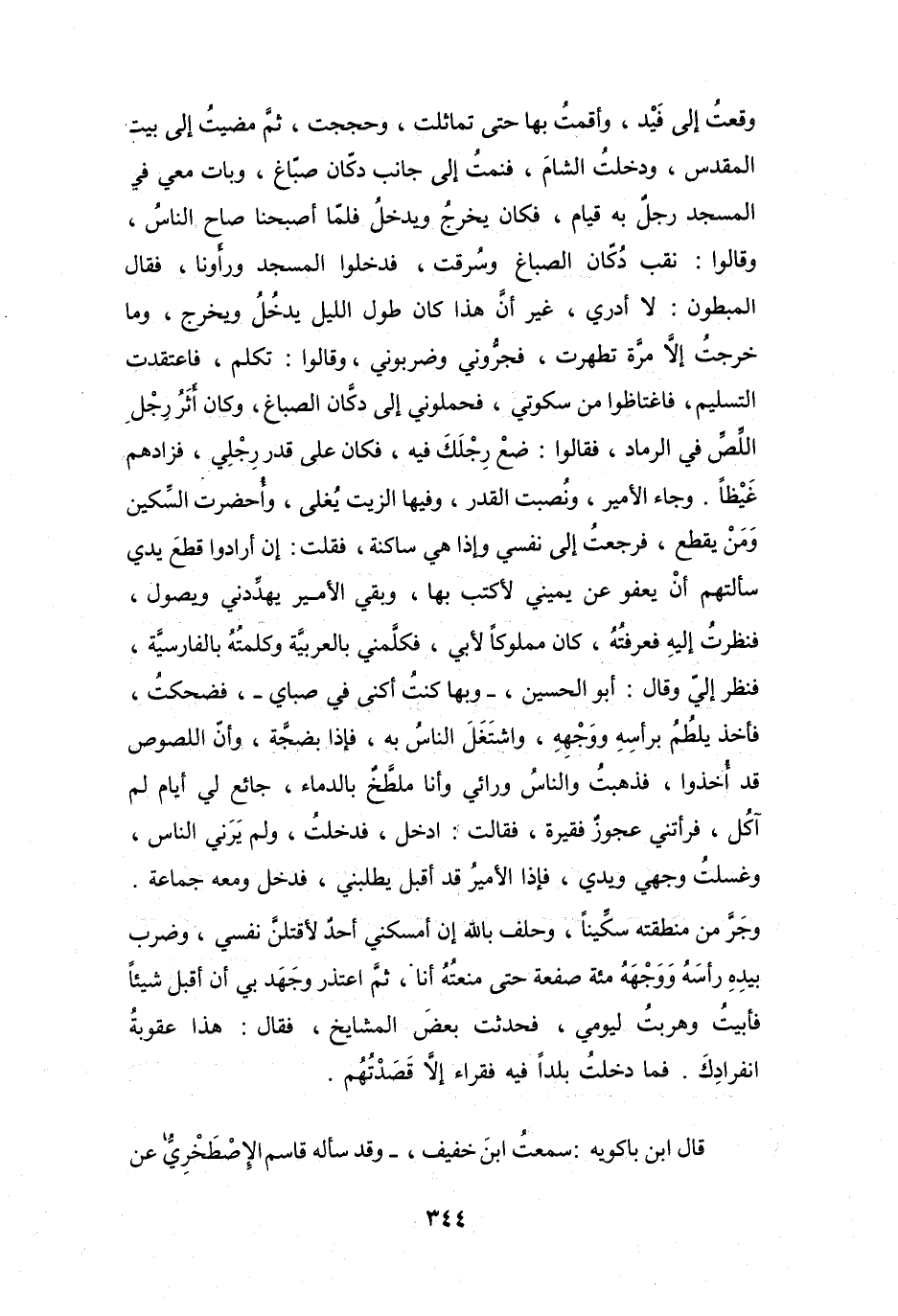 وَجَاءَ الأَمِيْرُ، وَنُصبتِ القِدْرُ، وَفِيْهَا الزَّيْتُ يُغْلَى، وَأُحضرتِ السِّكِّينُ وَمَنْ يقطعُ، فَرَجَعتُ إِلَى نَفْسِي وَإِذَا هِيَ سَاكنةٌ، فَقُلْتُ: إِنْ أَرَادُوا قطعَ يَدِي سَأَلتُهُمْ أَنْ يَعْفُو عَنْ يَمِيْنِي لأَكتبَ بِهَا، وَبَقِيَ الأَمِيْرُ يُهَدِّدُنِي وَيصولُ، فَنَظَرْتُ إِلَيْهِ فَعَرفتُهُ، كَانَ مَمْلُوكاً لأَبِي، فَكَلَّمَنِي بِالعَرَبِيَّةِ وَكَلَّمْتُهُ بِالفَارِسِيَّةِ، فَنَظَرَ إِلِيَّ وَقَالَ: أَبُو الحُسَيْنِ، - وَبِهَا كُنْتُ أُكنَى فِي صِبَايَ -، فضحكْتُ، فَأَخَذَ يَلطُمُ بِرَأْسِهِ وَوَجْهِهِ، وَاشتَغَلَ النَّاسُ بِهِ، فَإِذَا بِضَجَّةٍ، وَأَنَّ اللُّصوصَ قَدِ أُخِذُوا، فَذَهَبتُ وَالنَّاسُ وَرَائِي وَأَنَا مُلَطَّخٌ بِالدِّمَاءِ، جَائِعٌ لِي أَيَّامٌ لَمْ آكُلْ، فَرَأَتْنِي عجوزٌ فَقيرَةٌ، فَقَالَتْ: ادْخُلْ، فَدَخَلتُ، وَلَمْ يَرَنِي النَّاسُ، وَغسلتُ وَجْهِي وَيَدِيَّ، فَإِذَا الأَمِيْرُ قَدِ أَقبلَ يَطلُبُنِي، فَدَخَلَ وَمَعَهُ جَمَاعَةٌ.