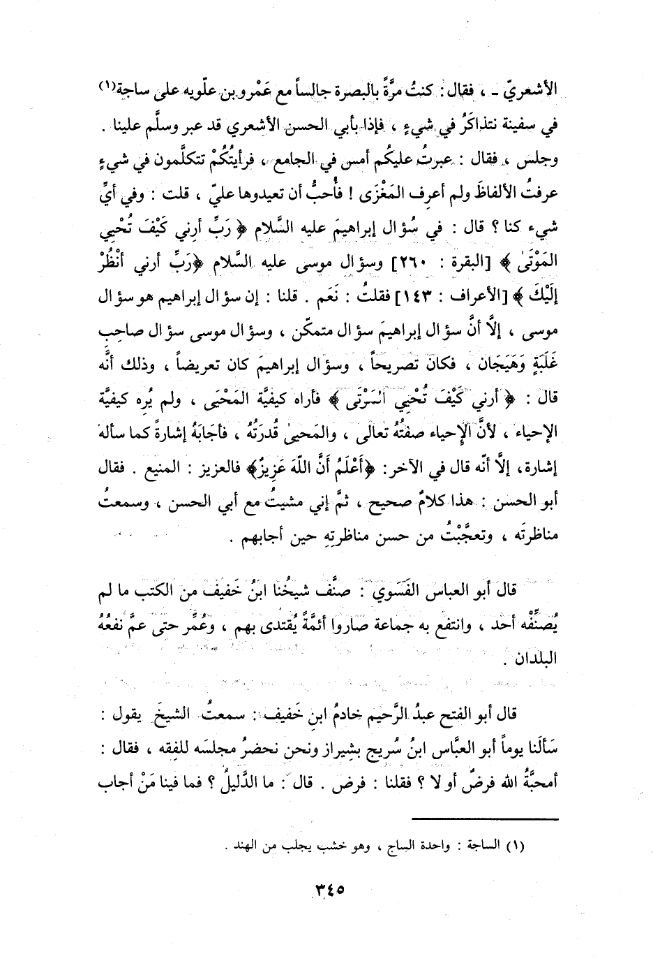 الأَشعرِيِّ - فَقَالَ: كُنْتُ مرَّةً بِالبَصْرَةِ جَالِساً مَعَ عَمْرِو بنِ عَلَّوَيْه عَلَى سَاجَةٍ (1) فِي سَفِيْنَةٍ نتذَاكَرُ فِي شَيْءٍ، فَإِذَا بِأَبِي الحَسَنِ الأَشعرِيِّ قَدْ عَبَرَ وَسلَّمَ عَلَيْنَا، وَجَلَسَ، فَقَالَ: عَبَرْتُ عليكُمْ أَمسُ فِي الجَامعِ، فرَأَيتُكُمْ تتكلَّمُوْنَ فِي شَيْءٍ عرفتُ الأَلفَاظَ وَلَمْ أَعرف المَغْزَى! فَأُحبُّ أَنْ تعيدُوهَا عليَّ، قُلْتُ: وَفِي أَيِّ شَيْءٍ كُنَّا؟ قَالَ: فِي سُؤَالِ إِبْرَاهِيْمَ - عَلَيْهِ السَّلاَمُ - {رَبِّ أَرنِي كيْفَ تُحْيِي المَوْتَى} [البَقَرَة:260] وَسؤَالِ مُوْسَى - عَلَيْهِ السَّلاَمُ - {رَبِّ أَرِنِي أَنْظُرْ إِلَيْكَ} [الْأَعْرَاف:143] فَقُلْتُ: نَعَمْ.