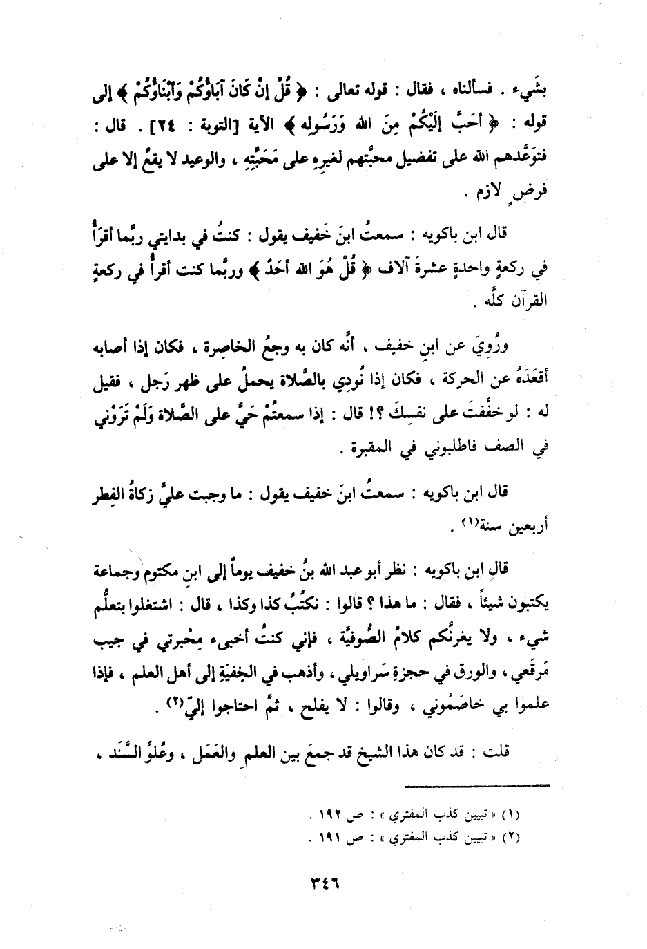 قَالَ ابْنُ بَاكَوَيْه: نظرَ أَبُو عَبْدِ اللهِ بنُ خَفِيْفٍ يَوْماً إِلَى ابْنِ مكتومٍ وَجَمَاعَةٍ يكتبُوْنَ شَيْئاً، فَقَالَ: مَا هَذَا؟ قَالُوا: نكتُبُ كَذَا وَكَذَا، قَالَ: اشتغِلُوا بتعلُّمِ شَيْءٍ، وَلاَ يَغُرَّنَّكُم كَلاَمُ الصُّوْفِيَّةِ، فَإِنِّي كُنْتُ أُخبِّئُ مِحْبرَتِي فِي جيبِ مَرقَعِي، وَالورقَ فِي حُجزَةِ سَرَاويلِي، وَأَذهبُ فِي الخِفْيَةِ إِلَى أَهْلِ العِلْمِ، فَإِذَا عَلِمُوا بِي خَاصَمُونِي، وَقَالُوا: لاَ يفلِحُ، ثُمَّ احتَاجُوا إِلِيَّ (2) .