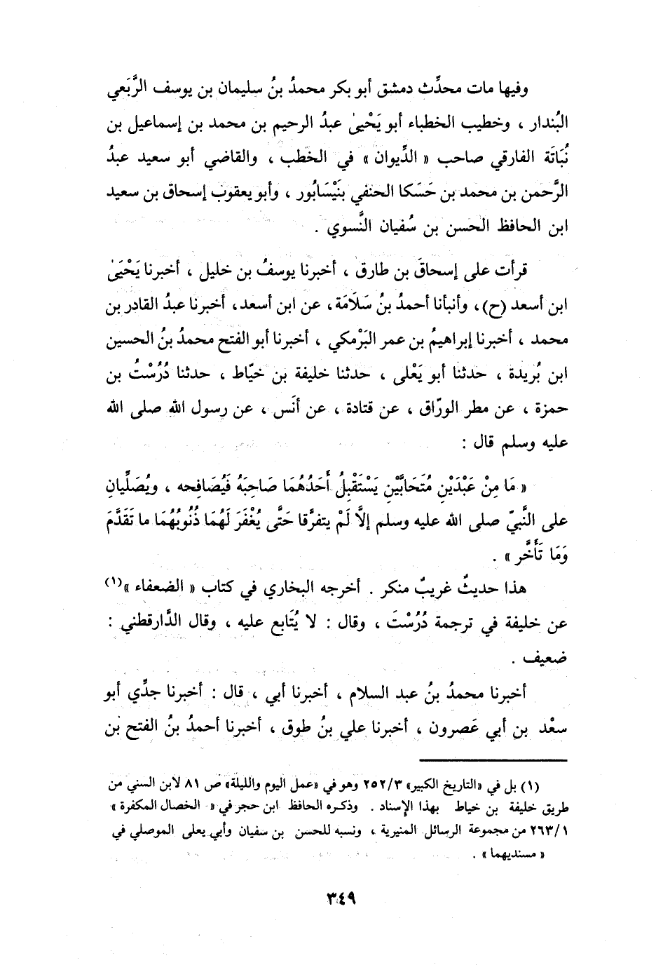 (1) بل في " التاريخ الكبير " 3 / 252 وهو في " عمل اليوم والليلة " ص 81 لابن السني من طريق خليفة بن خياط بهذا الإسناد. وذكره الحافظ ابن حجر في " الخصال المكفرة " 1 / 263 من مجموعة الرسائل المنيرية، ونسبه للحسن بن سفيان وأبي يعلى الموصلي في " مسنديهما ".