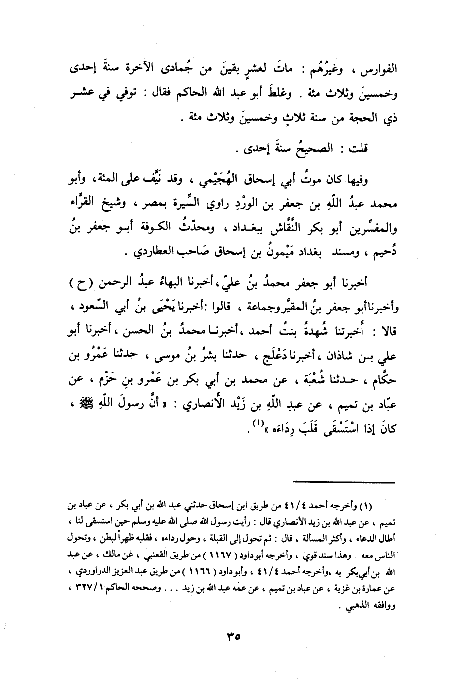أَخْبَرَتْنَا شُهْدَةُ بِنْتُ أَحْمَدَ، أَخْبَرَنَا مُحَمَّدُ بنُ الحَسَنِ، أَخْبَرَنَا أَبُو عَلِيٍّ بنُ شَاذَانَ، أَخْبَرَنَا دَعْلَجٌ، حَدَّثَنَا بِشْرُ بنُ مُوْسَى، حَدَّثَنَا عَمْرُو بنُ حَكَّامٍ، حَدَّثَنَا شُعْبَةُ، عَنْ مُحَمَّدِ بنِ أَبِي بَكْرٍ بنِ عَمْرِو بنِ حَزْمٍ، عَنْ عَبَّادِ بنِ تَمِيمٍ، عَنْ عَبْدِ اللهِ بنِ زَيْدَ الأَنْصَارِيِّ: