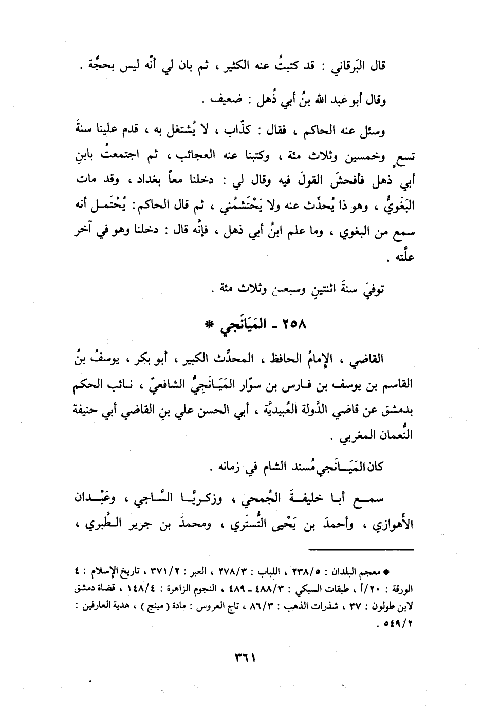 (*) معجم البلدان: 5 / 238، اللباب: 3 / 278، العبر: 2 / 371، تاريخ الإسلام: 4 الورقة: 20 / أ، طبقات السبكي: 3 / 488 - 389، النجوم الزاهرة: 4 / 148، قضاة دمشق لابن طولون: 37، شذرات الذهب: 3 / 86، تاج العروس: مادة (مينج) هدية العارفين: 2 / 549.