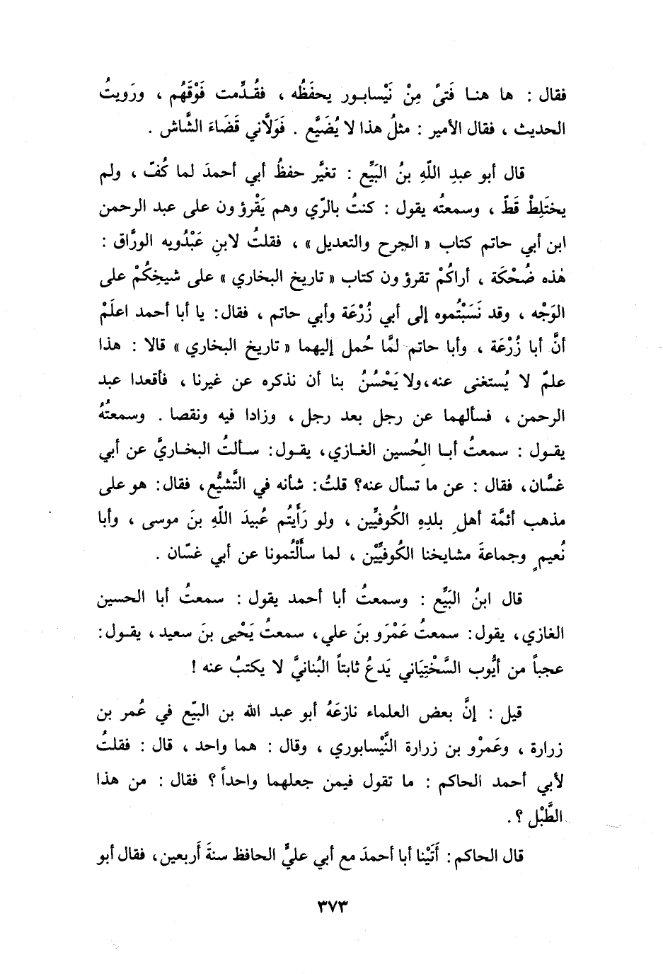 قَالَ أَبُو عَبْدِ اللهِ بنُ البَيِّعِ: تغيَّرَ حفظُ أَبِي أَحْمَدَ لمَا كُفَّ، وَلَمْ يختَلِطْ قَطُّ، وَسَمِعْتُهُ يَقُوْلُ: كُنْتُ بِالرَّيِّ وَهُم يَقْرَؤُونَ عَلَى عَبْدِ الرَّحْمَنِ بنِ أَبِي حَاتِمٍ كِتَابَ (الجرحِ وَالتَّعدِيلِ) فَقُلْتُ لابنِ عَبْدُوَيْه الوَرَّاقِ: هَذِهِ ضُحْكَةٌ، أَرَاكُمْ تقرُؤُونَ كِتَابَ (تَاريخِ البُخَارِيِّ) عَلَى شيخِكُمْ عَلَى الوَجْهِ، وَقَدْ نَسَبْتُمُوهُ إِلَى أَبِي زُرْعَةَ وَأَبِي حَاتِمٍ، فَقَالَ: يَا أَبَا أَحْمَدَ اعلَمْ أَنَّ أَبَا زُرْعَةَ وَأَبَا حَاتمٍ لَمَّا حُملَ إِليهُمَا (تَاريخُ البُخَارِيِّ) قَالاَ: