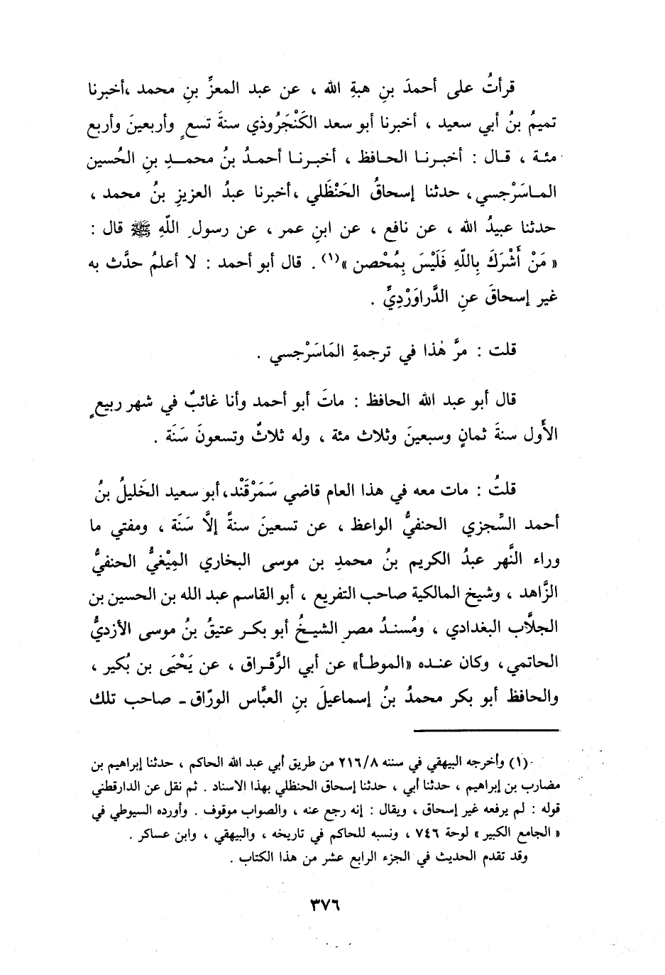 أَخْبَرَنَا الحَافِظُ، أَخْبَرَنَا أَحْمَدُ بنُ مُحَمَّدِ بنِ الحُسَيْنِ المَاسَرْجسِيُّ، حَدَّثَنَا إِسْحَاقُ الحَنْظَلِيُّ، أَخْبَرَنَا عَبْدُ العَزِيْزِ بنُ مُحَمَّدٍ، حَدَّثَنَا عُبَيْدُ اللهِ، عَنْ نَافِعٍ، عَنِ ابْنِ عُمَرَ: