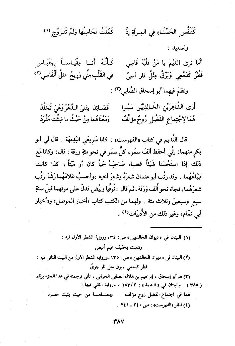 والبيتان في " اليتيمة ": 2 / 183، ورواية الثاني فيها: هما في اجتماع الفضل زوج مؤلف * ومعناهما من حيث يثبت مفرد (4) انظر " الفهرست ": ص 240 - 241.