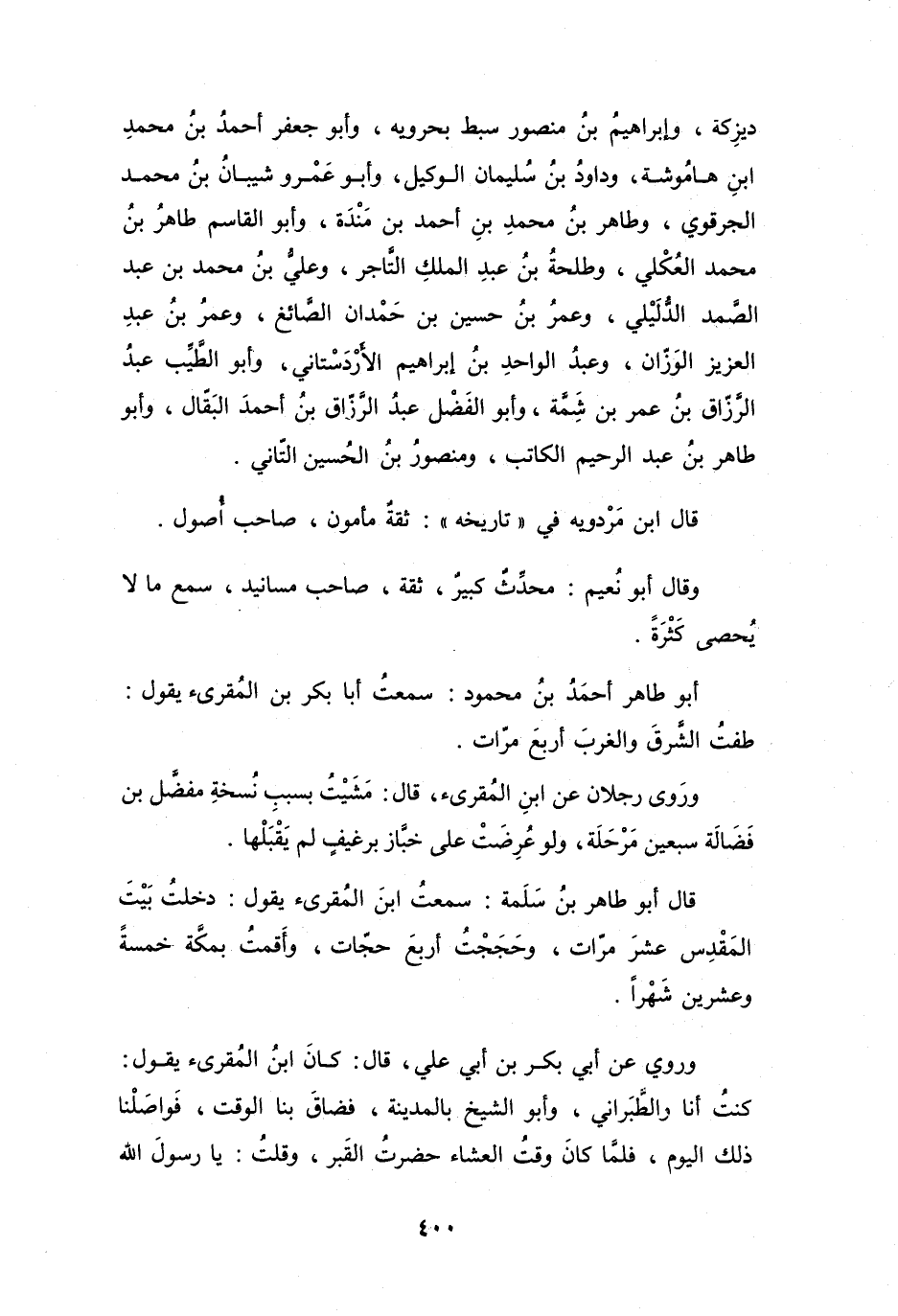 قَالَ أَبُو طَاهِرٍ أَحْمَدُ بنُ مَحْمُوْدٍ: سَمِعْتُ أَبَا بَكْرٍ بنَ المُقْرِئِ يَقُوْلُ: طِفْتُ الشَّرقَ وَالغربَ أَرْبَعَ مَرَّاتٍ.
