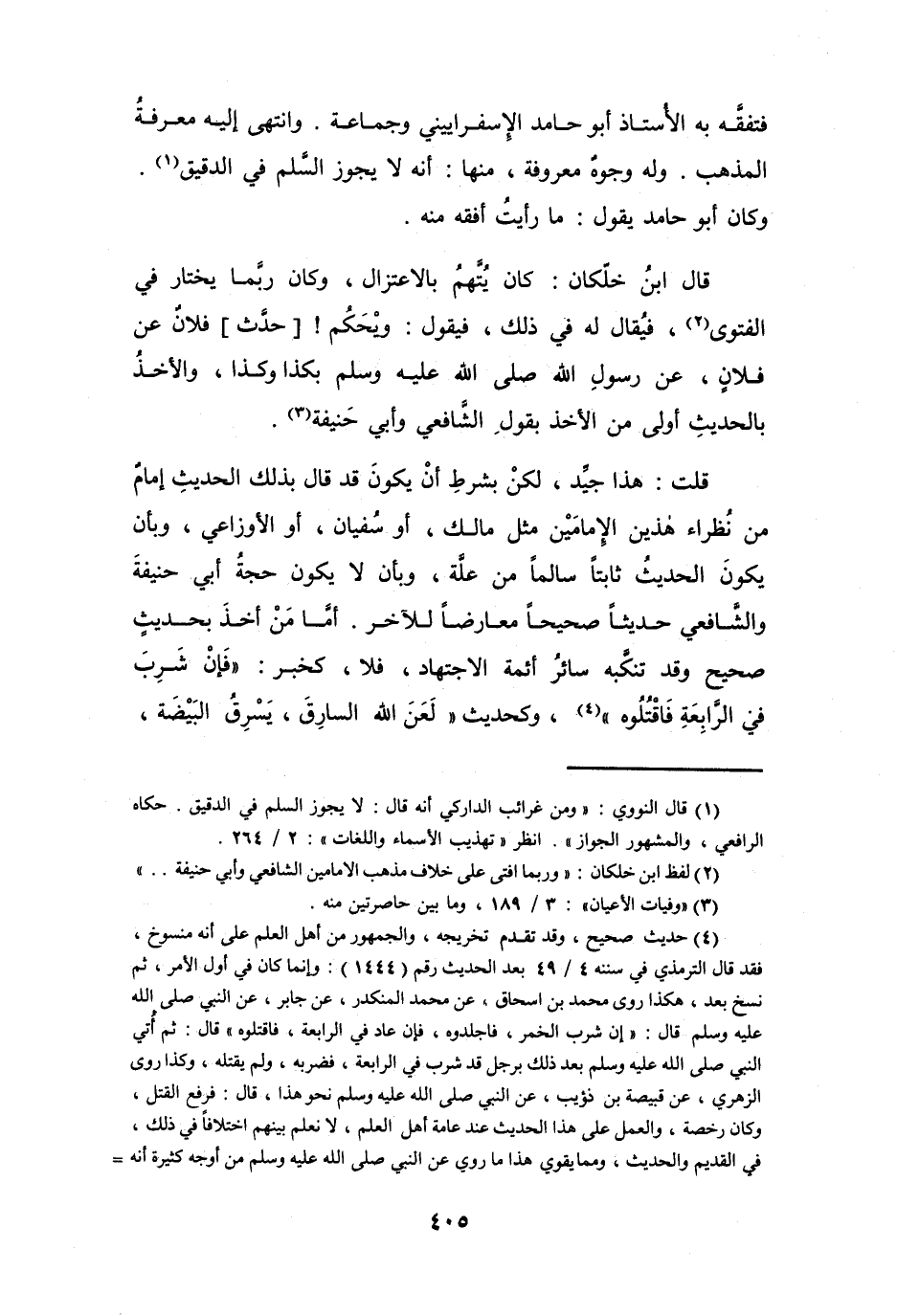 قُلْتُ: هَذَا جَيِّدٌ، لَكِنْ بِشَرْطِ أَنْ يَكُونَ قَدْ قَالَ بِذَلِكَ الحَدِيْثِ إِمَامٌ مِنْ نُظَرَاءِ الإِمَامَيْنِ مِثْلُ مَالِكٍ، أَوْ سُفْيَانَ، أَوِ الأَوْزَاعِيِّ، وَبأَنْ يَكُونَ الحَدِيْثُ ثَابِتاً سَالِماً مِنْ عِلَّةٍ، وَبأَنْ لاَ يَكُونَ حُجَّةُ أَبِي حَنِيْفَةَ وَالشَّافِعِيِّ حَدِيْثاً صحيحاً معَارضاً للآخَرِ.