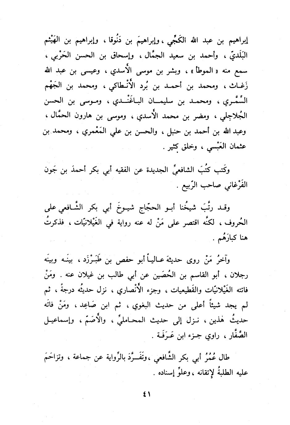 وَقَدْ رَتَّبَ شَيْخُنَا أَبُو الحجَّاجِ شُيُوْخَ أَبِي بَكْرٍ الشَّافِعِيِّ عَلَى الحُرُوْفِ، لَكِنَّهُ اقْتَصَرَ عَلَى مَنْ لَهُ عَنْهُ رِوَايَةٌ فِي (الغَيْلاَنِيَّاتِ) ، فَذَكَرْتُ هُنَا كِبَارَهُم.