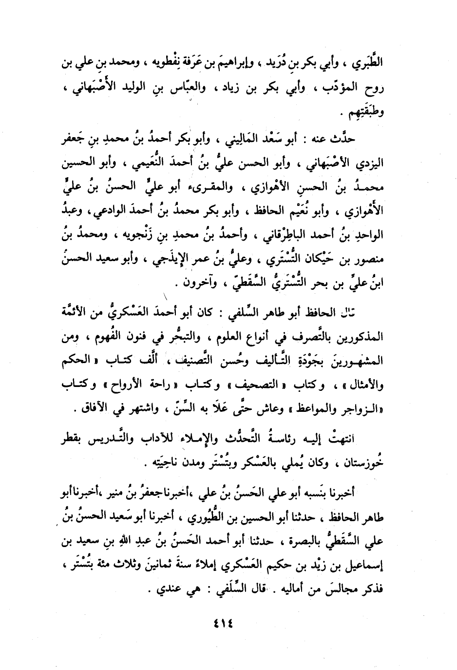 أَخْبَرَنَا بِنَسبهِ أَبُو عَلِيٍّ الحَسَنُ بنُ عَلِيٍّ، أَخْبَرَنَا جَعْفَرُ بنُ مُنِيرٍ، أَخْبَرَنَا أَبُو طَاهِرٍ الحَافِظُ، حَدَّثَنَا أَبُو الحُسَيْنِ بنُ الطُّيُورِيِّ، أَخْبَرَنَا أَبُو سَعِيْدٍ الحَسَنُ بنُ عَلِيٍّ السَّقَطِيُّ بِالبَصْرَةِ، حَدَّثَنَا أَبُو أَحْمَدَ الحَسَنُ بنُ عَبْدِ اللهِ بنِ سَعِيْدِ بنِ إِسْمَاعِيلَ بنِ زَيْدِ بنِ حَكِيْمٍ العَسْكَرِيُّ إِملاَءً سَنَةَ ثَمَانِيْنَ وَثَلاَثِ مائَةٍ بِتُسْتَرَ ... ، فَذكَرَ مَجَالِسَ مِنْ أَمَالِيهِ. قَالَ السِّلَفِيُّ: هِيَ عِنْدِي.