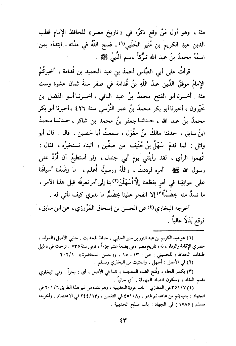 مائَةٍ، وَهُوَ أَوَّلُ مَنْ وَقَعَ ذِكْرُهُ فِي (تَارِيْخِ مِصْرَ) لِلحَافِظِ الإِمَامِ قطبِ الدِّيْنِ عَبْدِ الكَرِيْمِ بنِ مُنيرٍ الحَلَبِيِّ (1) - فَسَحَ اللهُ فِي مُدَّتِهِ - ابْتَدَأَهُ بِمَن اسْمُهُ مُحَمَّدُ بنُ عَبْدِ اللهِ تَبَرُّكاً بِاسْمِ النَّبِيِّ - صَلَّى اللَّهُ عَلَيْهِ وَسَلَّمَ -.