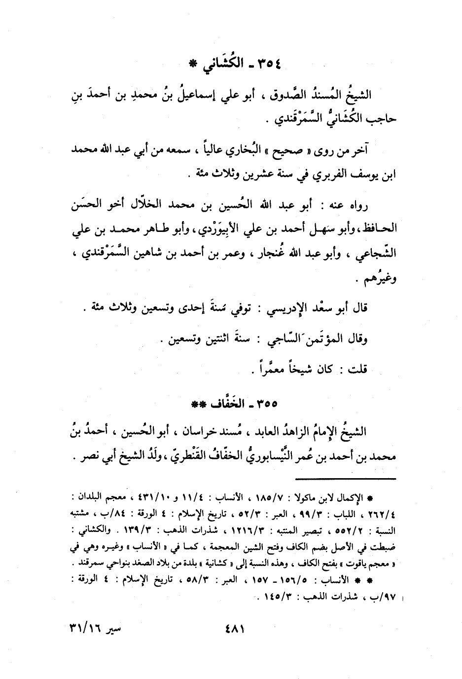 (*) الإكمال لابن ماكولا: 7 / 185، الأنساب: 4 / 11، و10 / 431، معجم البلدان: 4 / 262، اللباب: 3 / 99، العبر: 3 / 52، تاريخ الإسلام: 4 الورقة: 84 / ب، مشتبه النسبة: 2 / 522، تبصير المنتبه: 3 / 1216، شذرات الذهب: 3 / 139، والكشاني: ضبطت في الأصل بضم الكاف وفتح الشين المعجمة، كما في " الأنساب " وغيره وهي في " معجم ياقوت " بفتح الكاف، وهذه النسبة إلى " كشانية " بلدة من بلاد الصغد بنواحي سمرقند.