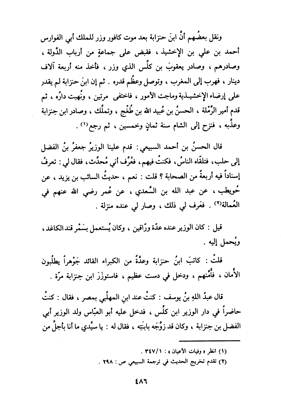 قَالَ الحَسَنُ بنُ أَحْمَدَ السَّبِيْعِيُّ: قَدِمَ عَلَيْنَا الوَزِيْرُ جَعْفَرُ بنُ الفَضْلِ إِلَى حلبَ، فتلقَّاهُ النَّاسُ، فكُنْتُ فِيهِمْ، فَعُرِّفَ أَنِّي مُحَدِّثٌ، فَقَالَ لِي: تعرفُ إِسْنَاداً فِيْهِ أَرْبَعَةٌ مِنَ الصَّحَابَةِ؟ قُلْتُ: نَعَمْ، حَدِيْثُ السَّائِبِ بنِ يَزِيْدَ، عَنْ حُوَيْطِبٍ، عَنْ عَبْدِ اللهِ بنِ السَّعْدِيِّ، عَنْ عُمَرَ رَضِي الله عَنْهُمْ فِي العُمَالَةِ (2) .