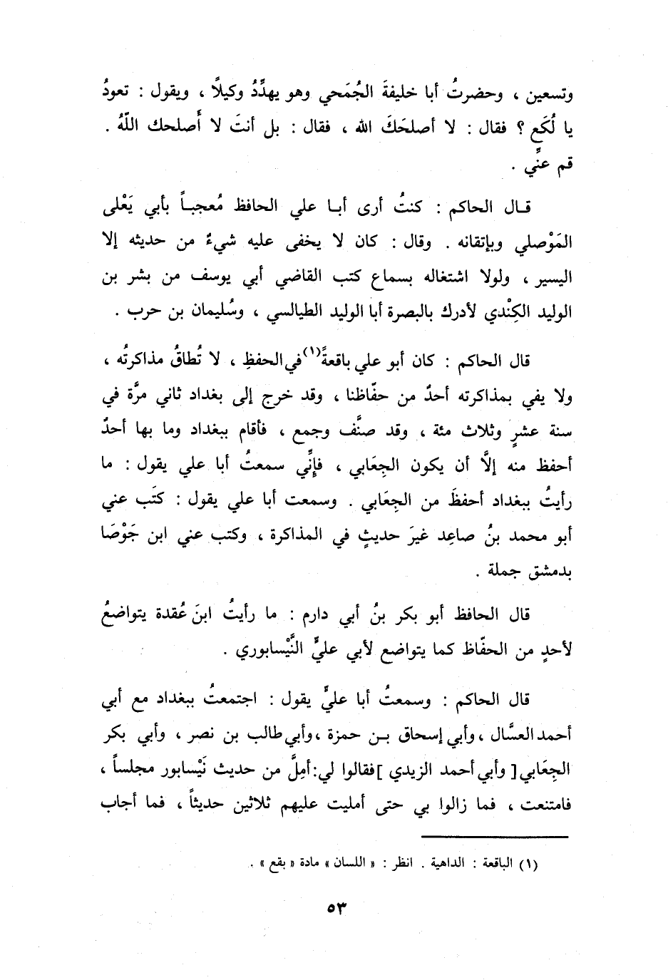 قَالَ الحَاكِمُ: كَانَ أَبُو عَلِيٍّ باقعَةً (1) فِي الحِفْظِ، لاَ تُطَاقُ مُذكرَاتُهُ، وَلاَ يَفِيَ بِمذكرَاتِهِ أَحدٌ مِنْ حُفَّاظِنَا، وَقَدْ خَرَجَ إِلَى بَغْدَادَ ثَانِيَ مرَّةٍ فِي سَنَةِ عَشْرٍ وَثَلاَثِ مائَةٍ، وَقَدْ صَنَّفَ وَجَمَعَ، فَأَقَامَ بِبَغْدَادَ وَمَا بِهَا أَحدٌ أَحفظُ مِنْهُ إِلاَّ أَنْ يَكُوْنَ الجِعَابِيَّ، فَإِنِّي سَمِعْتُ أَبَا علِيٍّ يَقُوْلُ: مَا رَأَيْتُ بِبَغْدَادَ أَحفظَ مِنَ الجِعَابِيِّ.