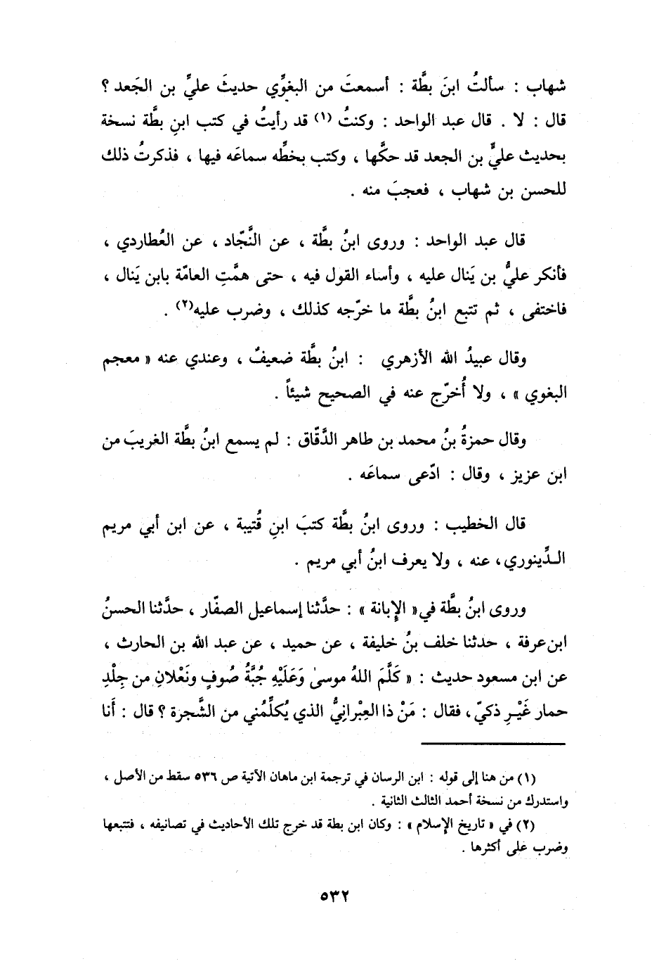 (2) في " تاريخ الإسلام ": وكان ابن بطة قد خرج تلك الأحاديث في تصانيفه، فتتبعها وضرب على أكثرها.