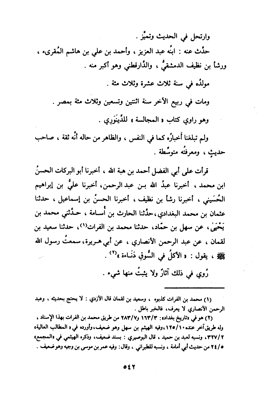 قَرَأْتُ عَلَى أَبِي الفَضْلِ أَحْمَدَ بنِ هِبَةَ اللهِ، أَخْبَرَنَا أَبُو البَرَكَاتِ الحَسَنُ بنُ مُحَمَّدٍ، أَخْبَرَنَا عَبْدُ اللهِ بنُ عَبْدِ الرَّحْمَنِ، أَخْبَرَنَا عَلِيُّ بنُ إِبْرَاهِيْمَ الحُسَيْنِيُّ، أَخْبَرَنَا رَشَأُ بنُ نَظيفٍ، أَخْبَرَنَا الحَسَنُ بنُ إِسْمَاعِيْلَ، حَدَّثَنَا عُثْمَانُ بنُ مُحَمَّدٍ البَغْدَادِيُّ، حَدَّثَنَا الحَارِثُ بنُ أُسَامَةَ، حَدَّثَنِي مُحَمَّدُ بنُ يَحْيَى، عَنْ سَهْلِ بنِ حَمَّادٍ، حَدَّثَنَا مُحَمَّدُ بنُ الفُرَاتِ (1) ، حَدَّثَنَا سَعِيْدُ بنُ لُقْمَانَ، عَنْ عَبْدِ الرَّحْمَنِ الأَنْصَارِيِّ، عَنْ أَبِي هُرَيْرَةَ: