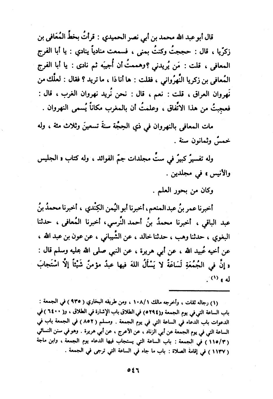 قَالَ أَبُو عَبْدِ اللهِ مُحَمَّدُ بنُ أَبِي نَصْرٍ الحُمَيْدِيُّ: قَرَأْتُ بخطِّ المُعَافَى بنِ زَكَرِيَّا، قَالَ: