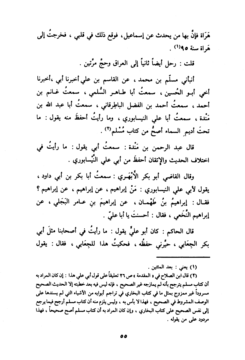 (2) قال ابن الصلاح في " المقدمة " ص 26 تعليقا على قول أبي علي هذا: إن كان المراد به أن كتاب مسلم يترجح بأنه لم يمازجه غير الصحيح، فإنه ليس فيه بعد خطبته إلا الحديث الصحيح مسرودا غير ممزوج بمثل ما في كتاب البخاري في تراجم أبوابه من الاشياء التي لم يسندها على الوصف المشروط في الصحيح، فهذا لا بأس به، وليس يلزم منه أن كتاب مسلم أرجح فيما يرجع إلى نفس الصحيح على كتاب البخاري، وإن كان المراد به أن كتاب مسلم أصح صحيحا، فهذا مردود على من يقوله.