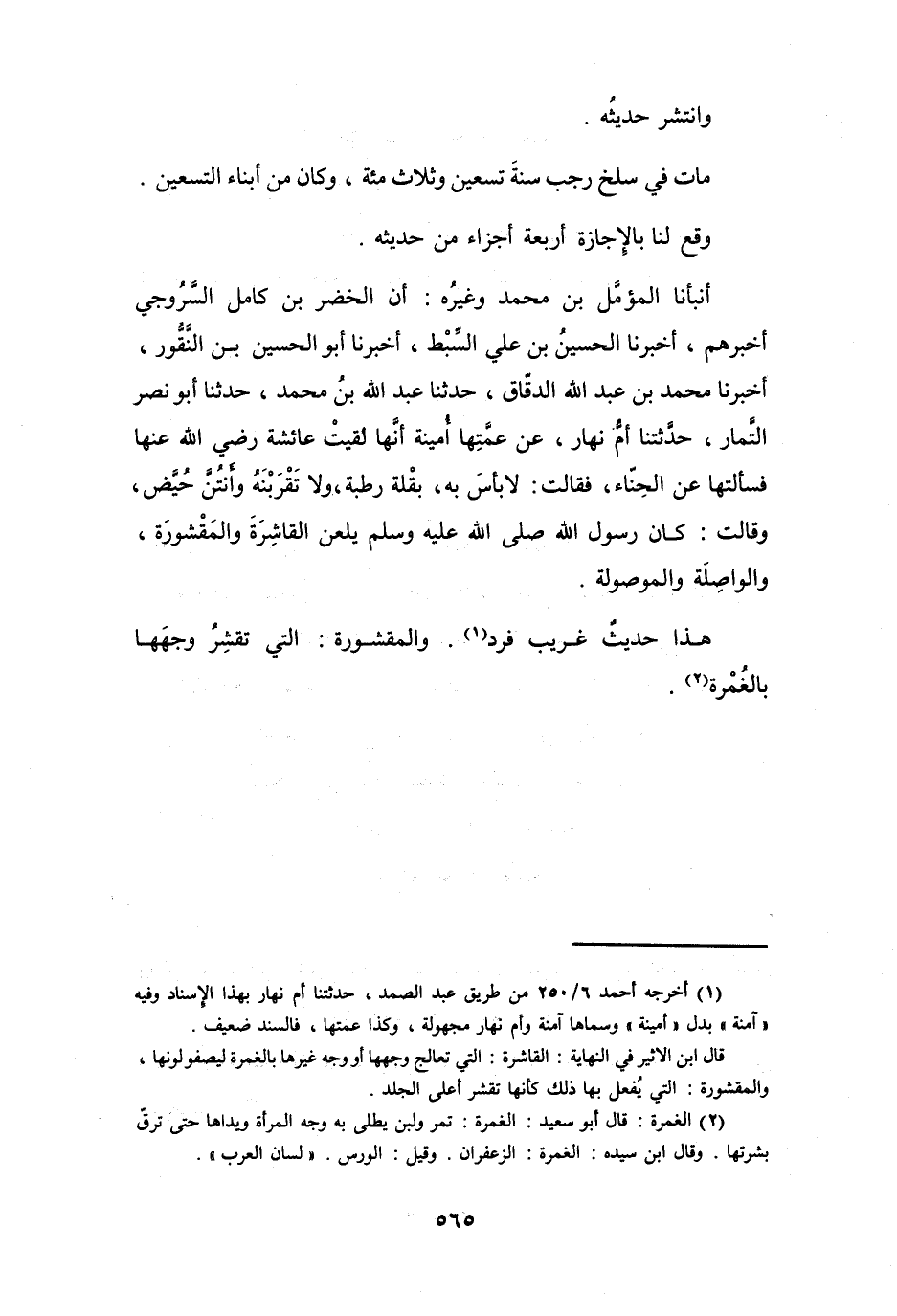 أَنْبَأَنَا المُؤَمَّلُ بنُ مُحَمَّدٍ وَغَيْرُهُ: أَنَّ الخضرَ بنَ كَامِلٍ السَّرُوْجِيَّ أَخْبَرَهُمْ، أَخْبَرَنَا الحُسَيْنُ بنُ عَلِيٍّ السِّبْطُ، أَخْبَرَنَا أَبُو الحُسَيْنِ بنُ النَّقُّوْرِ، أَخْبَرَنَا مُحَمَّدُ بنُ عَبْدِ اللهِ الدَّقَّاقُ، حَدَّثَنَا عَبْدُ اللهِ بنُ مُحَمَّدٍ، حَدَّثَنَا أَبُو نَصْرٍ التَّمَّارُ، حَدَّثَتْنَا أُمُّ نَهَارٍ، عَنْ عَمَّتِهَا أُمينةُ أَنَّهَا لَقِيَتْ عَائِشَةَ - رَضِيَ اللهُ عَنْهَا - فَسَأَلَتْهَا عَنِ الحِنَّاءِ، فَقَالَتْ: لاَ بَأْسَ بِهِ، بَقْلَةٌ رَطْبَةٌ، وَلاَ تَقْرَبْنَهُ وَأَنْتُنَّ حُيَّضٌ، وَقَالَتْ: