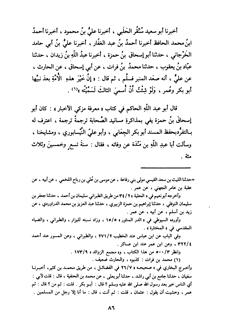أَخْبَرَنَا أَبُو سَعِيْدٍ سُنْقُرُ الحَلَبِيُّ، أَخْبَرَنَا عَلِيُّ بنُ مَحْمُوْدٍ، أَخْبَرَنَا أَحْمَدُ بنُ مُحَمَّدٍ الحَافِظُ، أَخْبَرَنَا أَحْمَدُ بنُ عَبْدِ الغفَّارِ، أَخْبَرَنَا عَلِيُّ بنُ أَبِي حَامِدٍ الخَرْجَانِيُّ، حَدَّثَنَا أَبُو إِسْحَاقَ بنُ حَمْزَةَ، أَخْبَرَنَا عَبْدُ اللهِ بنُ زَيْدَانَ، حَدَّثَنَا عَبَّادُ بنُ يَعْقُوْبَ، حَدَّثَنَا مُحَمَّدُ بنُ فُرَاتٍ، عَنْ أَبِي إِسْحَاقَ، عَنِ الحَارِثِ، عَنْ عَلِيٍّ أَنَّهُ صعَدَ المِنْبَرَ فَسَلَّمَ، ثُمَّ قَالَ: إِنَّ خَيْرَ هَذِهِ الأُمَّةِ بَعْدَ نَبِيِّهَا أَبُو بَكْرٍ وَعُمَرُ، وَلَوْ شِئْتُ أَنْ أُسَمِّيَ الثَّالِثَ لَسَمَّيْتُهُ (1) .
