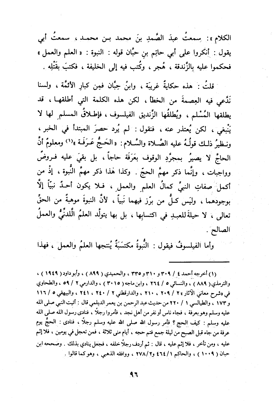 قُلْتُ: هَذِهِ حِكَايَةٌ غريبَةٌ، وَابنُ حِبَّانَ فَمِنْ كبارِ الأَئِمَةِ، وَلَسْنَا نَدَّعِي فِيْهِ العِصْمَةَ مِنَ الخَطَأِ، لَكِنَّ هَذِهِ الكَلِمَةَ الَّتِي أَطلقَهَا، قَدْ يُطلقُهَا المُسْلِمُ، وَيُطلقُهَا الزِّنديقُ الفيلسوفُ، فَإِطلاَقُ المُسْلِمِ لَهَا لاَ يَنْبَغِي، لَكِنْ يُعتذرُ عَنْهُ، فَنَقُوْل: لَمْ يُردْ حصرَ المبتدأِ فِي الخَبَرِ، وَنظيرُ ذَلِكَ قولُهُ - عَلَيْهِ الصَّلاَةُ وَالسَّلاَمُ -: (الحَجُّ عَرَفَةٌ (1)) وَمعلومٌ أَنَّ الحَاجَّ لاَ يصيرُ بِمُجَرَّدِ الوُقُوْفِ بِعَرَفَةِ حَاجّاً، بَلْ بَقِيَ عَلَيْهِ فروضٌ وَواجبَاتٌ، وَإِنَّمَا ذكرَ مُهمَّ الحَجِّ.
