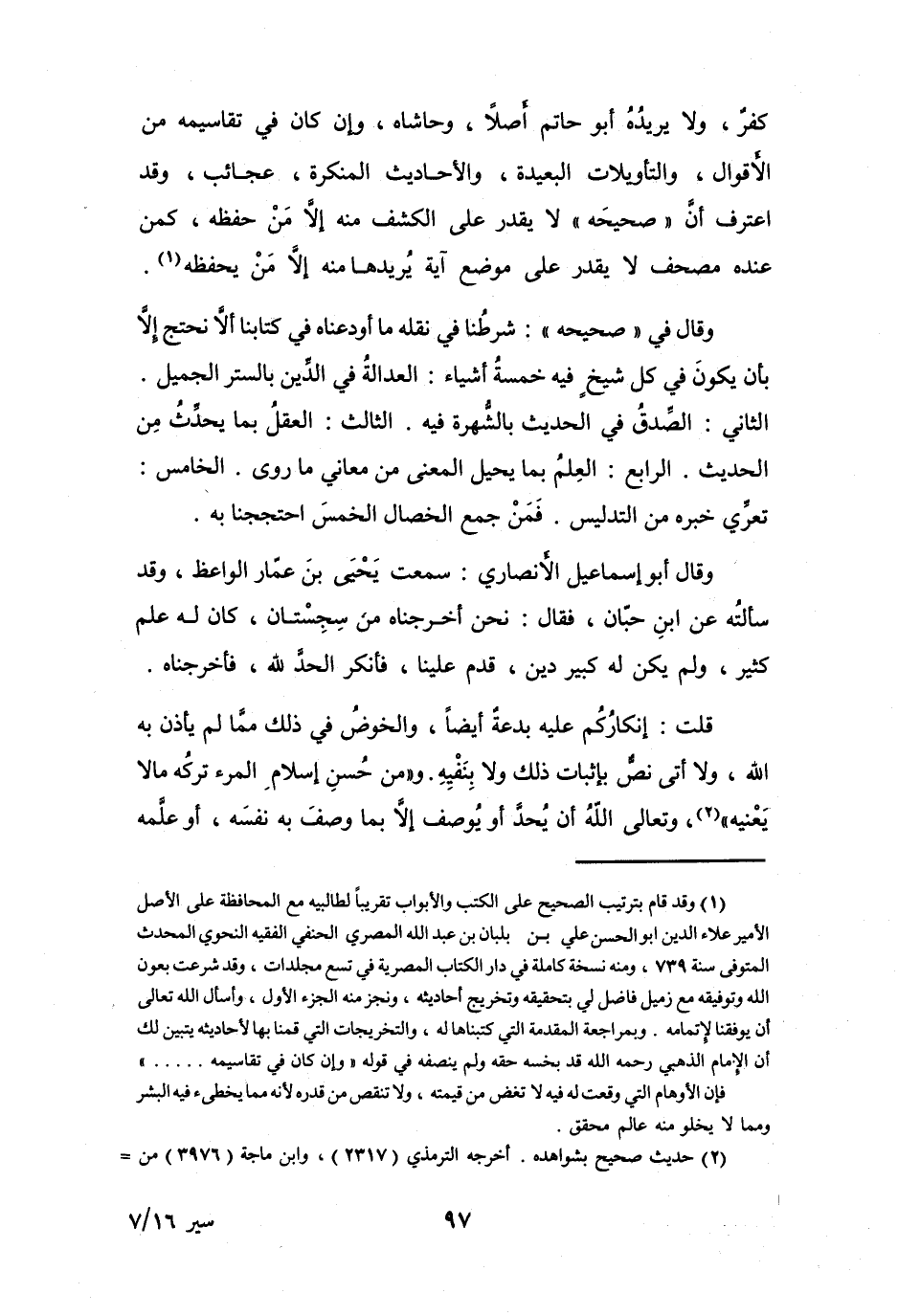 كفرٌ، وَلاَ يريدُهُ أَبُو حَاتِمٍ أَصلاًَ، وَحَاشَاهُ، وَإِنْ كَانَ فِي تقَاسيمِهِ مِنَ الأَقوَالِ، وَالتَّأَويلاَتِ البعيدَةِ، وَالأَحَادِيثِ المنكرَةِ، عجَائِبٌ، وَقَدِ اعترفَ أَنَّ (صحيحَهُ) لاَ يقدرُ عَلَى الكشفِ مِنْهُ إِلاَّ مَنْ حِفْظَهُ، كمنْ عِنْدَهُ مصحفٌ لاَ يقدرُ عَلَى مَوْضِعِ آيَةٍ يريدُهَا مِنْهُ إِلاَّ مَنْ يحفظُهُ (1) .