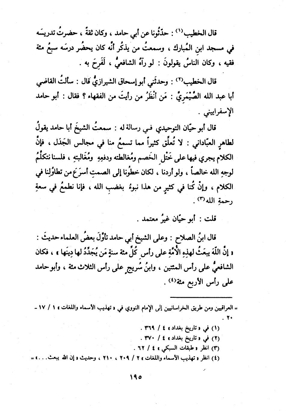 قَالَ ابْنُ الصَّلاَح: وَعَلَى الشَّيْخ أَبِي حَامِدٍ تَأَوَّلَ بَعْضُ العُلَمَاء حَدِيْثَ: (إِنَّ اللهَ يَبْعَثُ لِهَذِهِ الأُمَّةِ عَلَى رَأْسِ كُلِّ مائَة سَنَةٍ مَنْ يُجَدِّدُ لَهَا دِينَهَا) فَكَانَ الشَّافِعِيُّ عَلَى رَأْس المائَتَيْنِ، وَابْنُ سُرَيْجٍ عَلَى رَأْس الثَّلاَث مائَة، وَأَبُو حَامِدٍ عَلَى رَأْس الأَرْبَع مائَة (4) .
