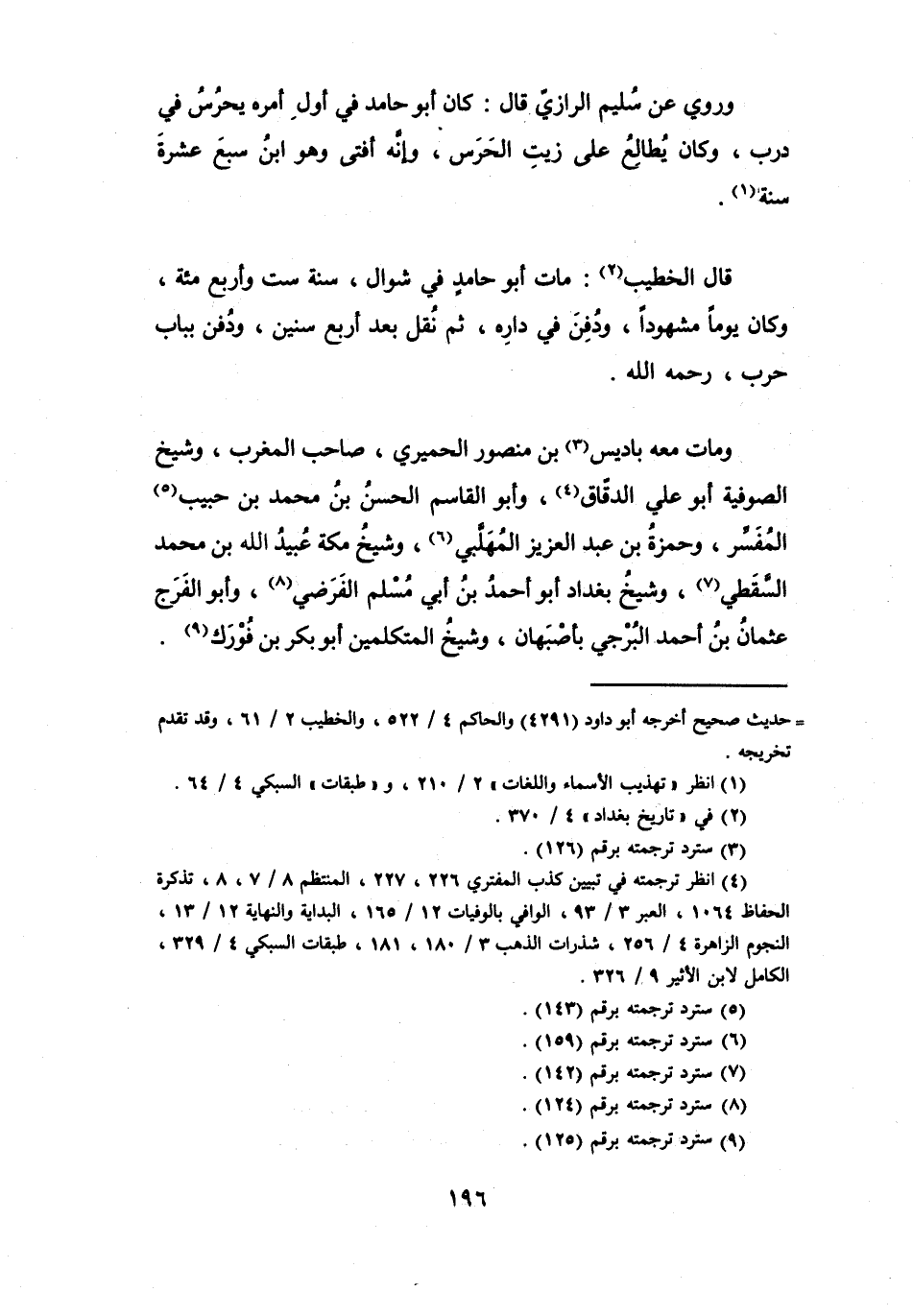 (4) انظر ترجمته في تبيين كذب المفتري 226، 227، المنتظم 8 / 7، 8، تذكرة الحفاظ 1064، العبر 3 / 93، الوافي بالوفيات 12 / 165، البداية والنهاية 12 / 13، النجوم الزاهرة 4 / 256، شذرات الذهب 3 / 180، 181، طبقات السبكي 4 / 329، الكامل لابن الأثير 9 / 326.