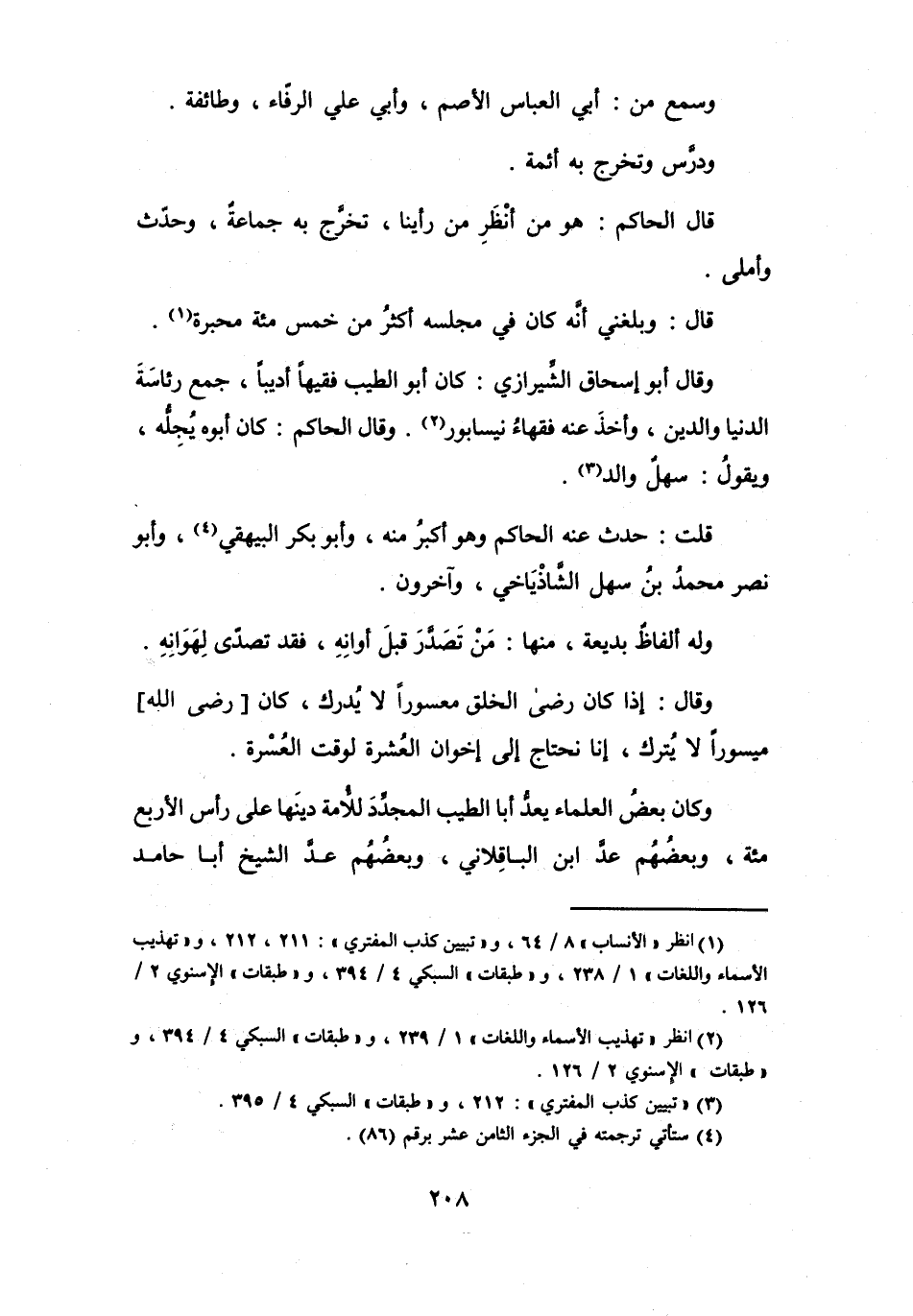 (1) انظر " الأنساب " 8 / 64، و" تبيين كذب المفتري ": 211، 212، و" تهذيب الأسماء واللغات " 1 / 238، و" طبقات " السبكي 4 / 394، و" طبقات " الاسنوي 2 / 126.