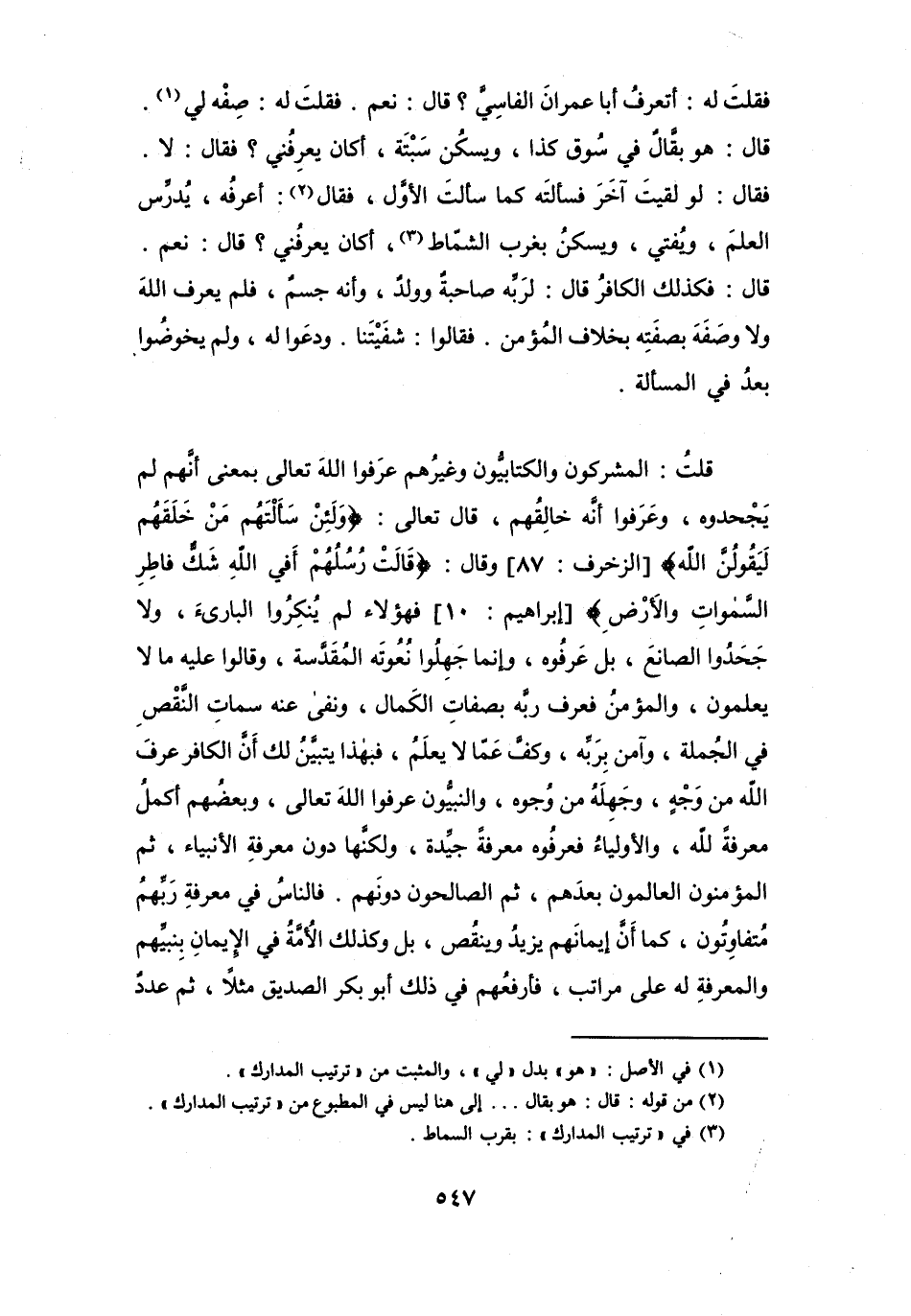 وَقَالَ: {قَالَتْ رُسُلُهُمْ أَفِي اللهِ شَكٌّ فَاطِرِ السَّموَاتِ وَالأَرْضِ} [إِبْرَاهِيْم:10] فَهَؤُلاَءِ لَمْ يُنْكِرُوا البَارِئَ، وَلاَ حَجَدُوا الصَّانعَ، بَلْ عَرَفُوهُ، وَإِنَّمَا جَهِلُوا نُعُوتَهُ المُقَدَّسَة، وَقَالُوا عَلَيْهِ مَا لاَ يَعْلَمُوْنَ، وَالمُؤْمِنُ فَعَرف رَبَّهُ بِصِفَاتِ الكَمَال، وَنفَى عَنْهُ سمَاتِ النَّقْصِ فِي الجُمْلَةِ، وآمن بِرَبِّهِ، وَكفَّ عَمَّا لاَ يعلَمُ، فَبهَذَا يتبيَّنُ لَكَ أَنَّ الكَافِر عَرَفَ اللهَ مِنْ وَجْهٍ، وَجَهِلَهُ مِنْ وُجُوه، وَالنبيُّون عرفُوا اللهَ - تَعَالَى -، وَبَعْضُهُم أَكملُ مَعْرِفَةً لله، وَالأَوْلِيَاءُ فَعَرفُوهُ مَعْرِفَةً جَيِّدَةً، وَلَكِنَّهَا دُوْنَ مَعْرِفَةِ الأَنْبِيَاء، ثُمَّ المُؤْمِنُوْنَ العَالِمُوْنَ بعدَهُم، ثُمَّ الصَّالِحُوْنَ دونَهُم.