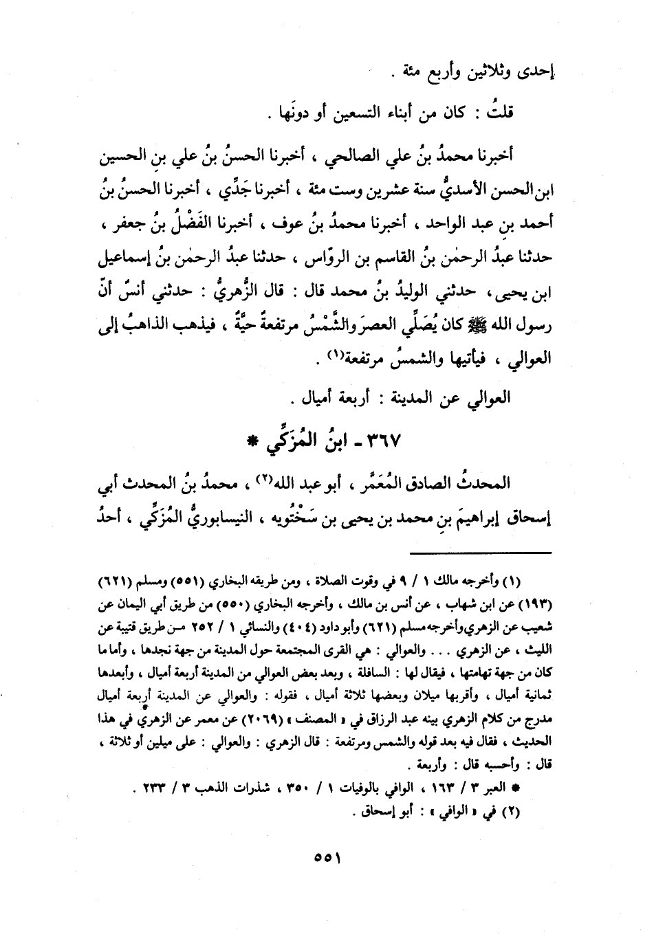 (1) وأخرجه مالك 1 / 9 في وقوت الصلاة، ومن طريقه البخاري (551) ومسلم (621) (193) عن ابن شهاب، عن أنس بن مالك، وأخرجه البخاري (550) من طريق أبي اليمان عن شعيب عن الزهري وأخرجه مسلم (621) وأبو داود (404) والنسائي 1 / 252 من طريق قتيبة عن الليث، عن الزهري ... والعوالي: هي القرى المجتمعة حول المدينة من جهة نجدها، وأما ما كان من جهة تهامتها، فيقال لها: السافلة، وبعد بعض العوالي من المدينة أربعة أميال، وأبعدها ثمانية أميال، وأقربها ميلان وبعضها ثلاثة أميال، فقوله: والعوالي عن المدينة أربعة أميال مدرج من كلام الزهري بينه عبد الرزاق في " المصنف " (2069) عن معمر عن الزهري في هذا الحديث، فقال فيه بعد قوله والشمس ومرتفعة: قال الزهري: والعوالي: على ميلين أو ثلاثة، قال: وأحسبه قال: وأربعة.