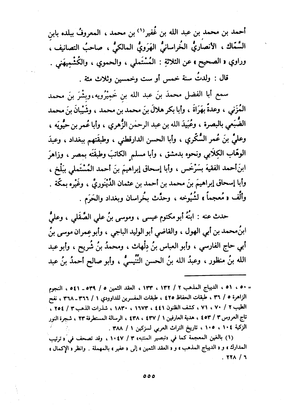 أَحْمَدَ بنِ مُحَمَّدِ بنِ عَبْدِ اللهِ بنِ غُفير (1) بن مُحَمَّدٍ، المَعْرُوفُ بِبَلَدِهِ: بِابْنِ السَّمَّاك الأَنْصَارِيُّ، الخُرَاسَانِيُّ، الهَرَوِيُّ، المَالِكِيُّ، صَاحِبُ التَّصَانِيْفِ، وَرَاوي (الصَّحِيْح) عَنِ الثَّلاَثَةِ: المُسْتَمْلِي، وَالحَمْوِيِّ، وَالكُشْمِيْهَنِيِّ.