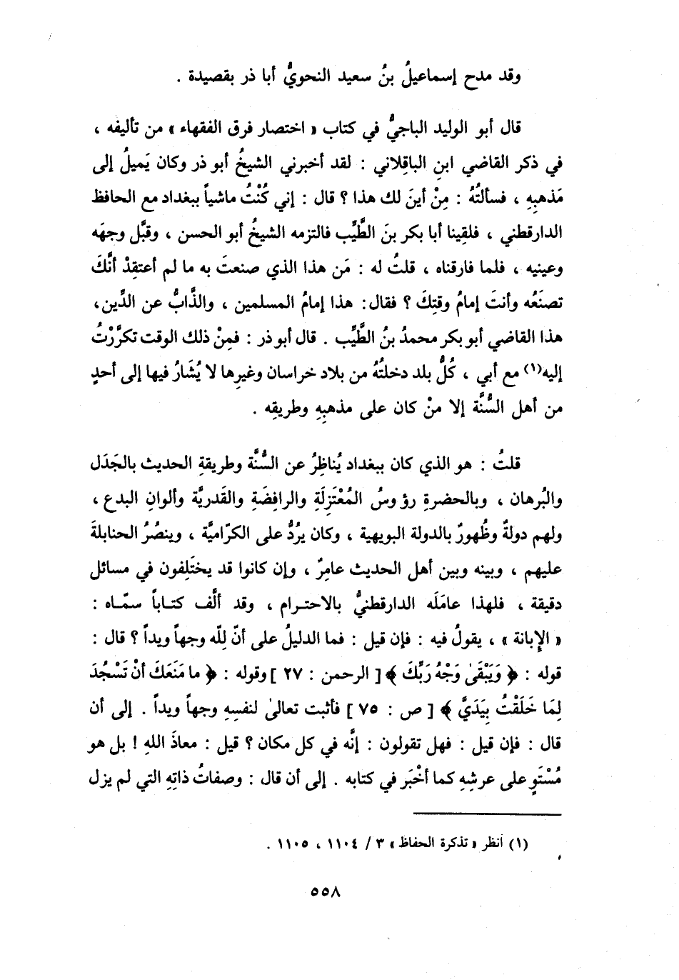 قُلْتُ: هُوَ الَّذِي كَانَ بِبَغْدَادَ يُنَاظِرُ، عَنِ السُّنَّة وَطَرِيْقَةِ الحَدِيْث بِالجَدَلِ وَالبُرْهَانِ، وَبَالحضرَةِ رُؤُوْسُ المُعْتَزِلَةِ وَالرَّافِضَةِ وَالقَدَرِيَّة وَأَلوَانِ البِدَع، وَلهُم دَوْلَةٌ وَظُهورٌ بِالدَّوْلَة البُوَيْهِيَّة، وَكَانَ يَرُدُّ عَلَى الكَرَّامِيَّة، وَينصُرُ الحَنَابِلَةَ عَلَيْهِم، وبَيْنَهُ وَبَيْنَ أَهْل الحَدِيْث عَامِرٌ، وَإِنْ كَانُوا قَدْ يَخْتَلِفُون فِي مَسَائِل دقيقَة، فلهَذَا عَامَلَه الدَّارَقُطْنِيُّ بِالاحْتِرَام، وَقَدْ أَلَّفَ كِتَاباً سَمَّاهُ: (الإِبَانَة) ، يَقُوْلُ فِيْهِ: فَإِن قِيْلَ: فَمَا الدَّلِيْلُ عَلَى أَنَّ للهِ وَجهاً وَيداً؟